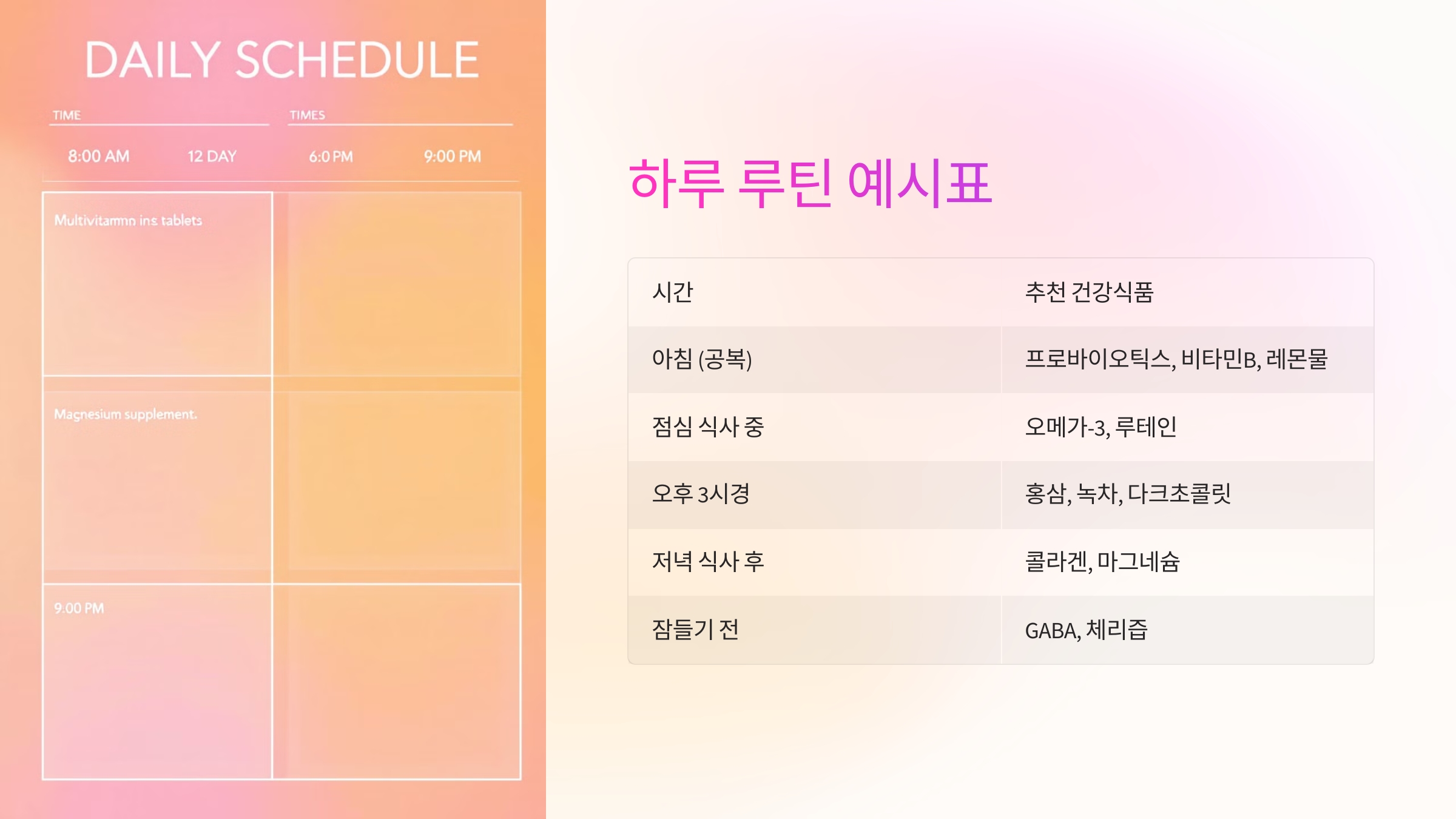 관련 태그: #건강식품 #영양제시간표 #건강루틴 #하루습관 #건강관리 #섭취방법 #비타민 #프로바이오틱스