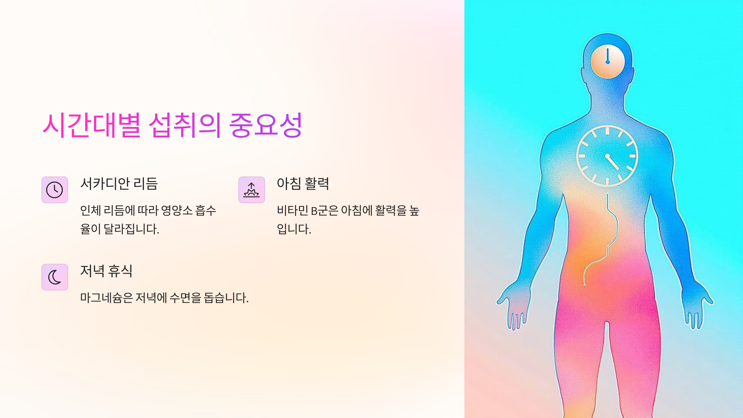 인체의 리듬(서카디안 리듬)에 따라 영양소의 흡수율이 다릅니다. 예를 들어 비타민 B군은 아침에 활력을 높이고, 마그네슘은 저녁에 수면을 돕습니다. 따라서 시간대별로 건강식품을 분산해서 먹는 것이 효과적이에요.