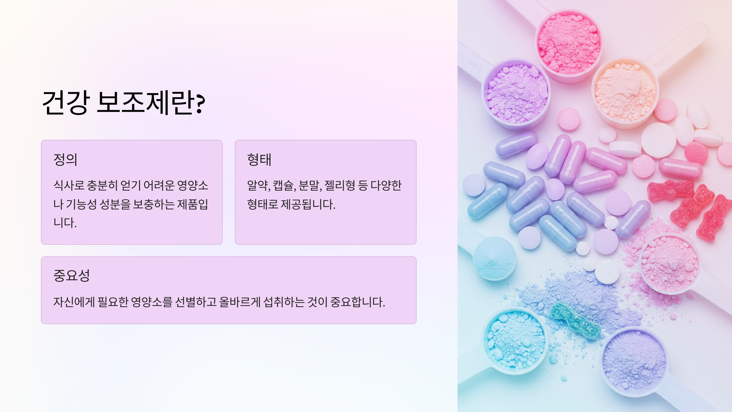 건강 보조제는 식사를 통해 충분히 얻기 어려운 영양소나 기능성 성분을 보충하기 위해 섭취하는 제품입니다. 최근에는 건강에 대한 관심이 높아지며 다양한 형태의 보조제가 출시되고 있습니다. 종류도 알약, 캡슐, 분말, 젤리형 등 다양하죠.