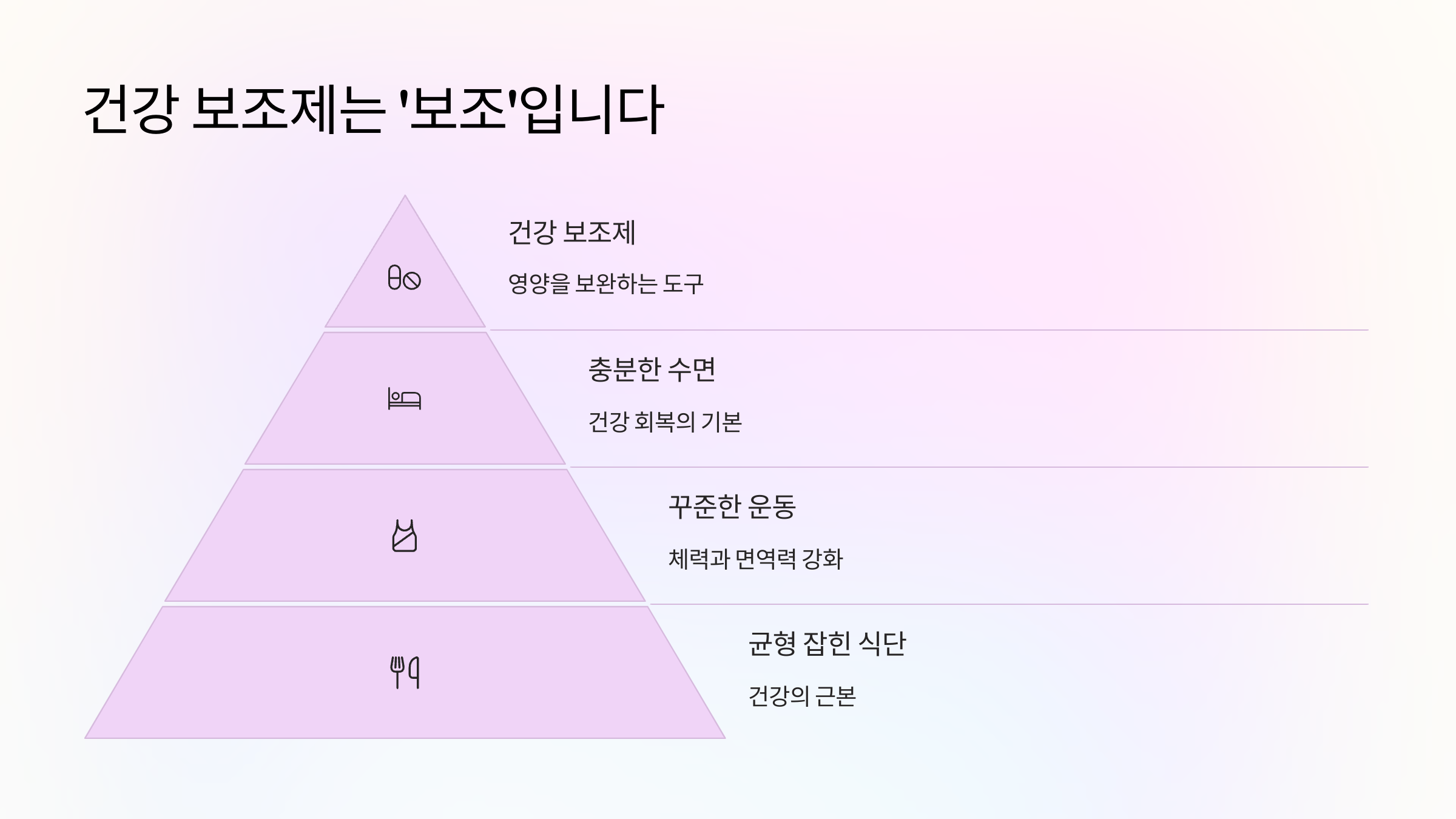 건강 보조제는 영양을 보완하는 도구일 뿐, 모든 건강 문제를 해결해주는 만능 열쇠는 아닙니다.
