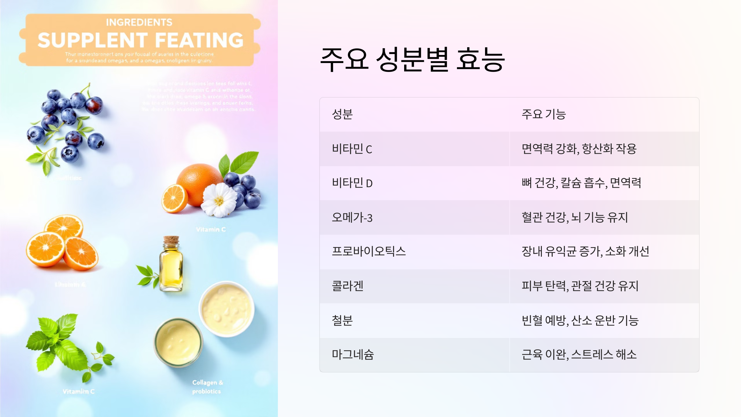 | 콜라겐 | 피부 탄력, 관절 건강 유지 |