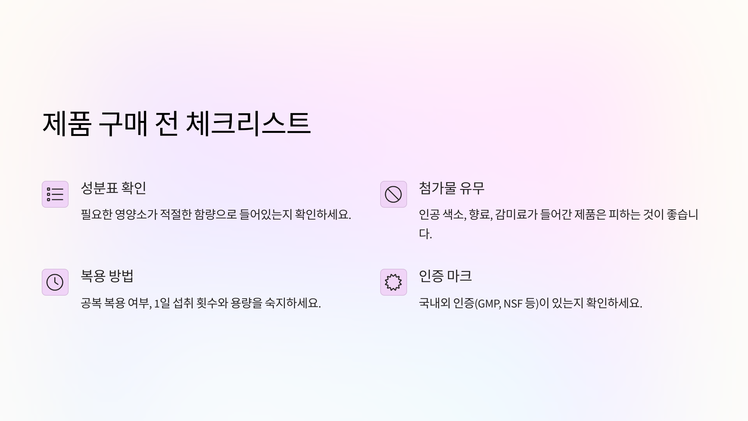 ✅ 인증 마크: 국내외 인증(GMP, NSF 등)이 있는지 확인하세요.
