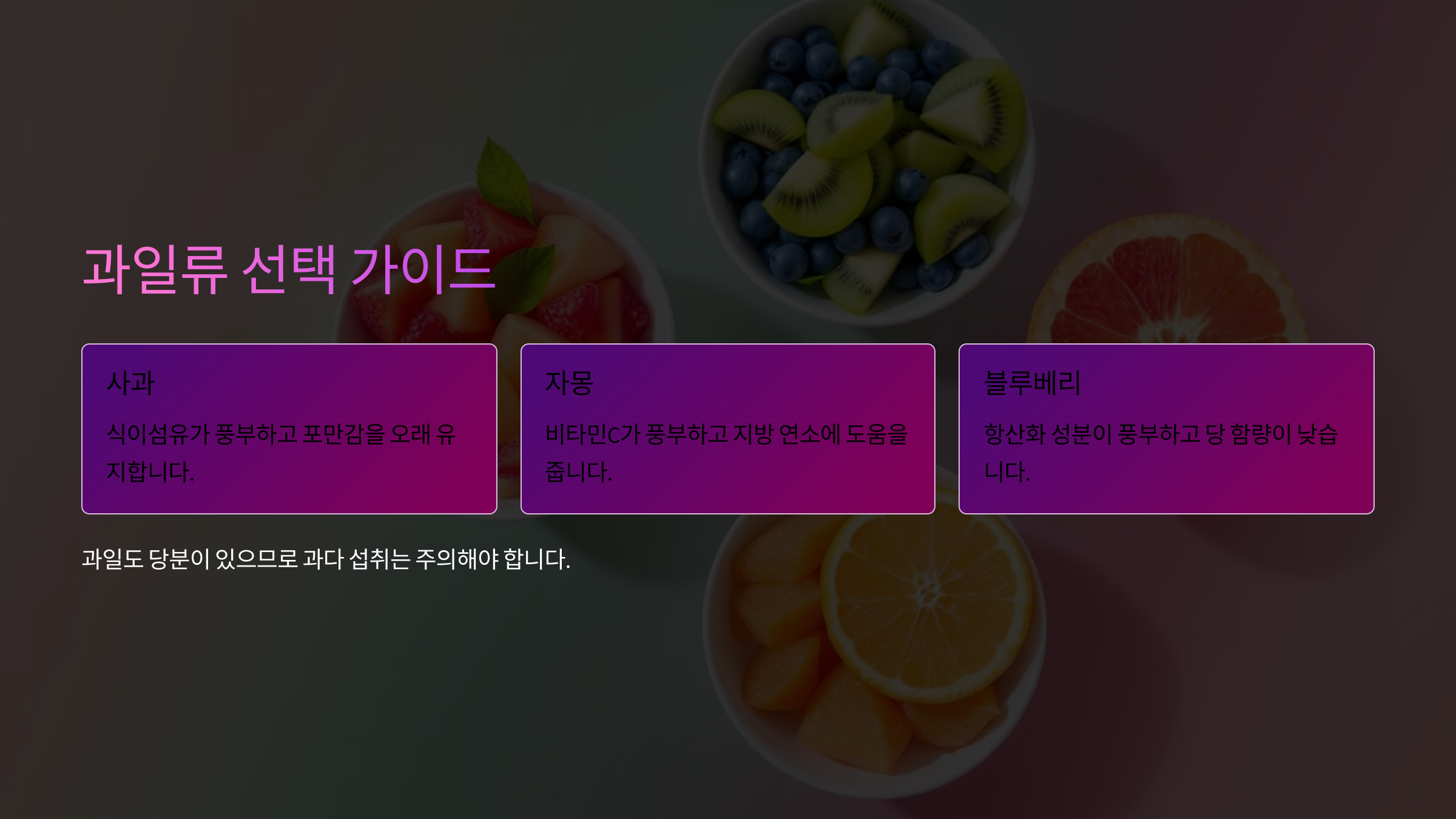 사과, 자몽, 블루베리, 키위 등은 비교적 저칼로리면서도 비타민이 풍부한 과일입니다. 단, 과일도 당분이 있으므로 과다 섭취는 주의해야 해요.