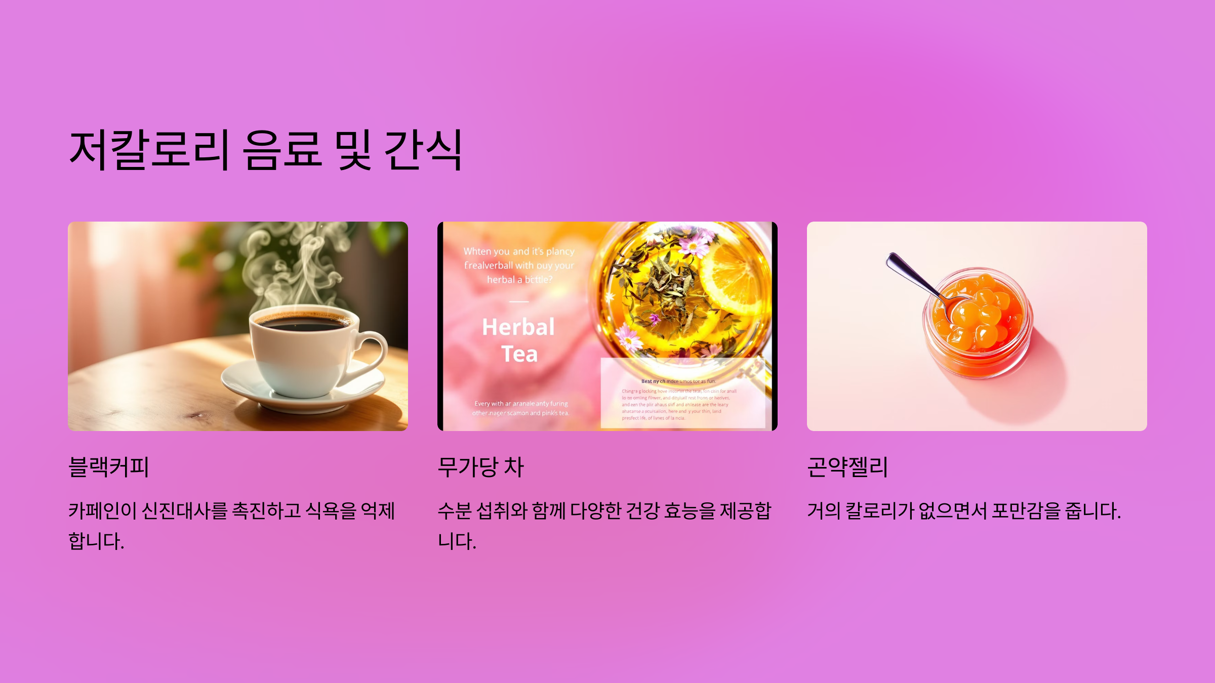 무가당 차, 블랙커피, 곤약젤리, 요즘 유행하는 단백질 스낵도 훌륭한 저칼로리 간식입니다.