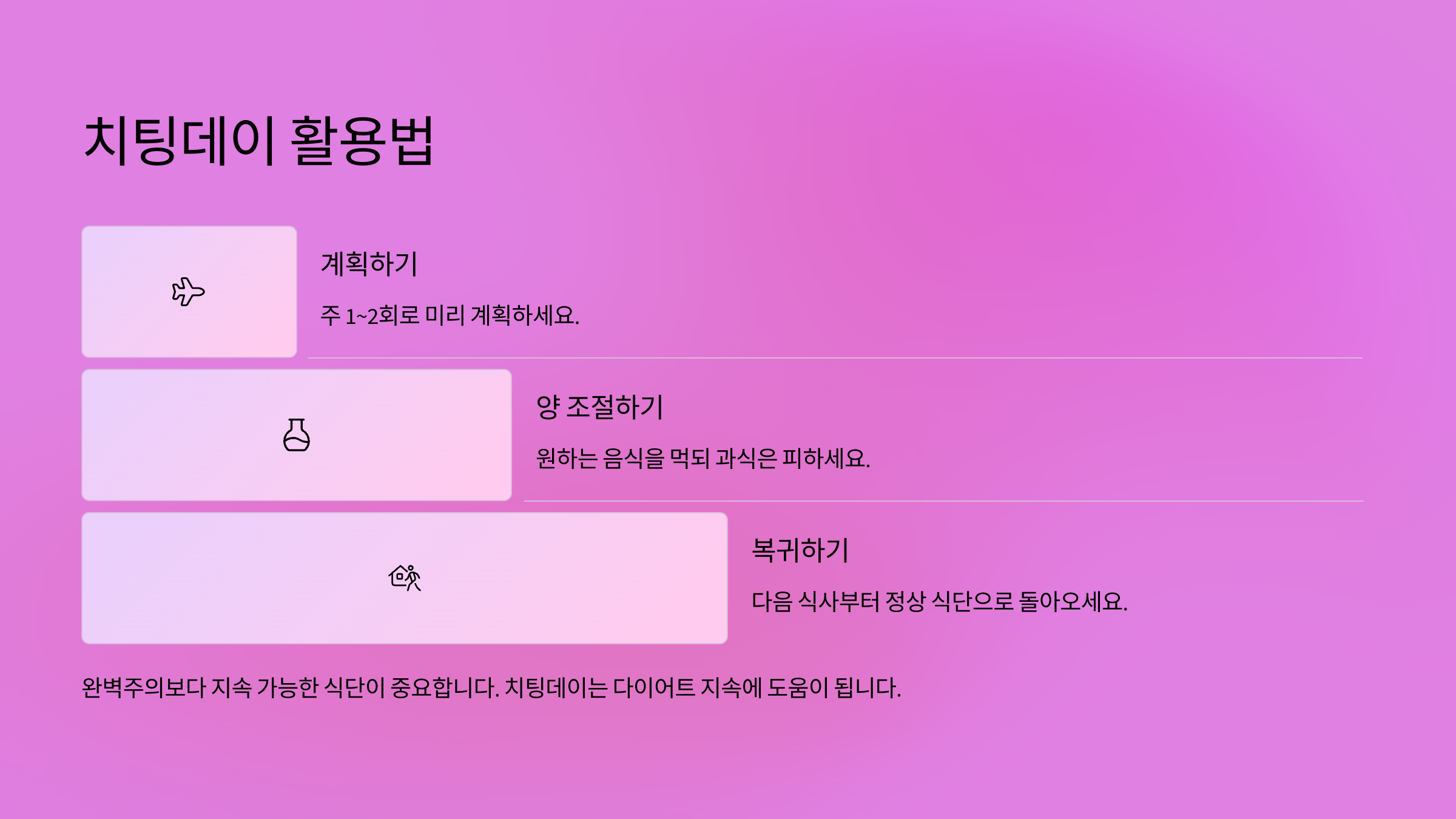 - 주 1~2회 치팅데이 허용완벽주의보다 지속 가능한 식단이 중요합니다.