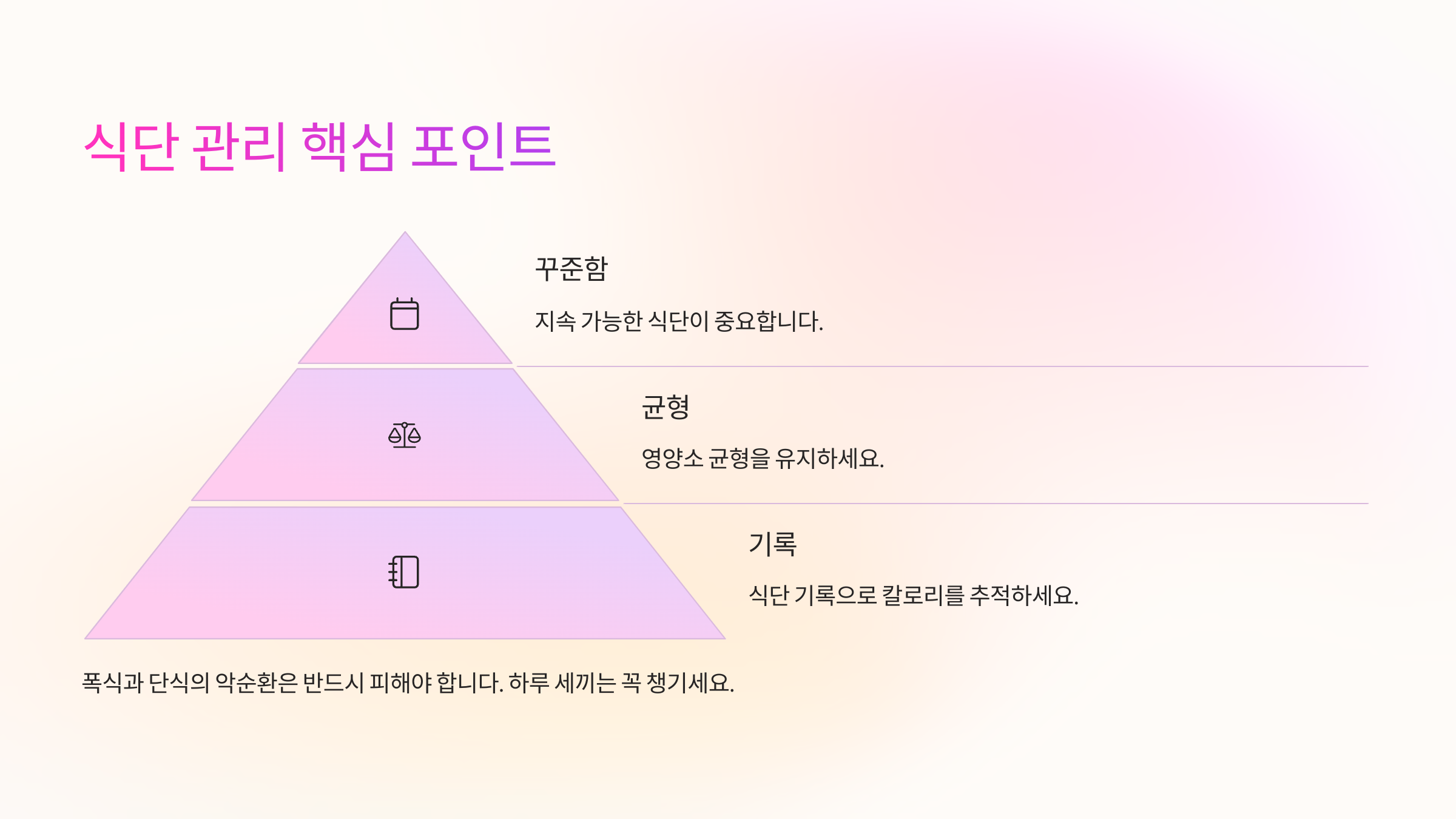 식단은 꾸준함이 생명입니다. 폭식 → 단식의 악순환은 반드시 피해야 해요.