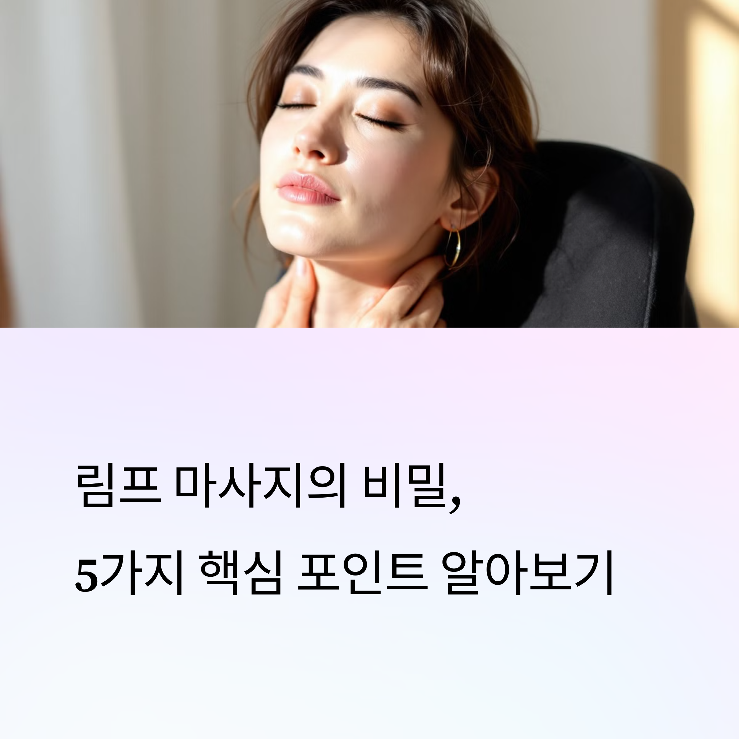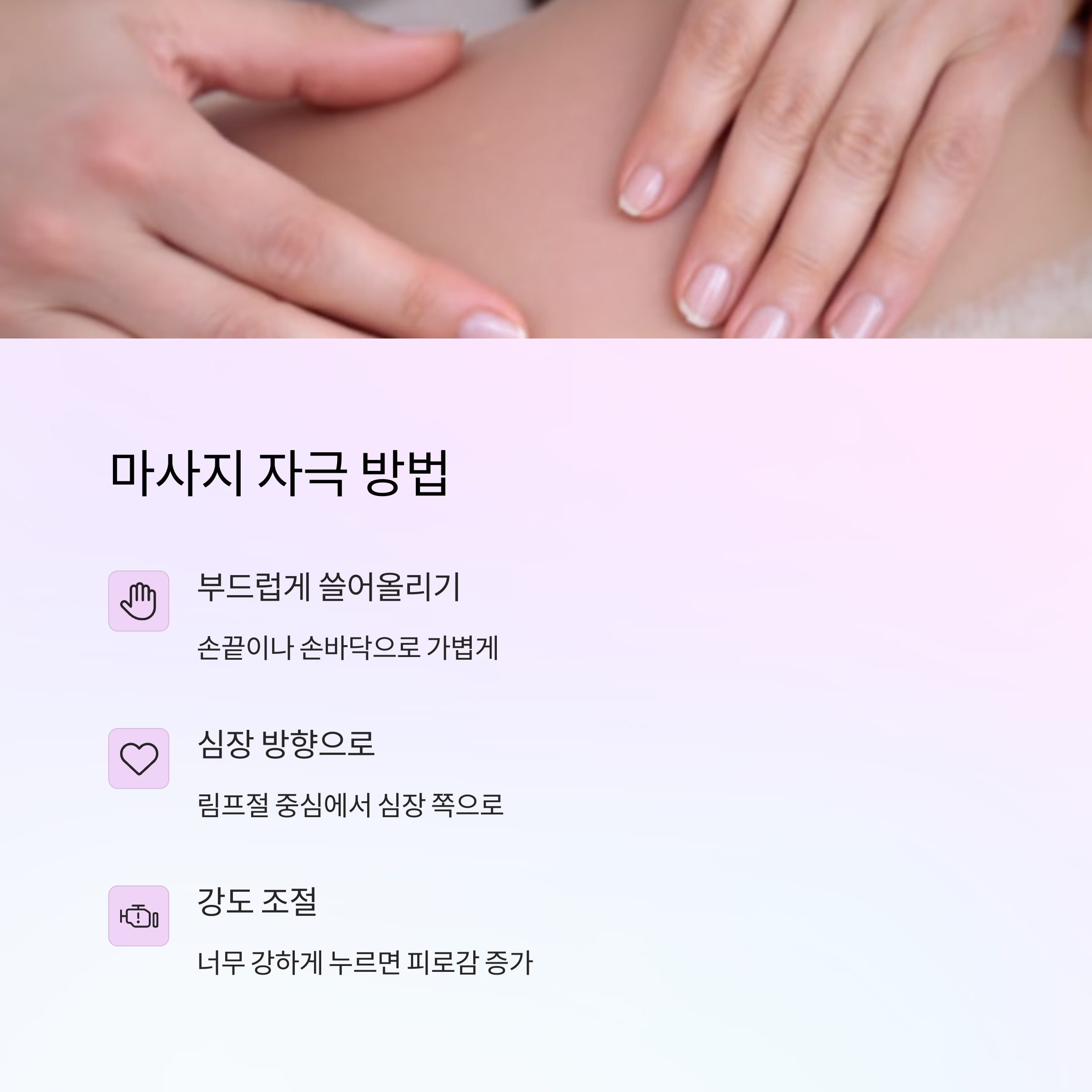 ✔ 손끝이나 손바닥으로 부드럽게 쓸어올리기 ✔ 손가락 끝으로 지그시 눌렀다 떼기 ✔ 림프절 중심 → 심장 방향으로 가볍게 ✔ 너무 강하게 누르면 오히려 피로감↑