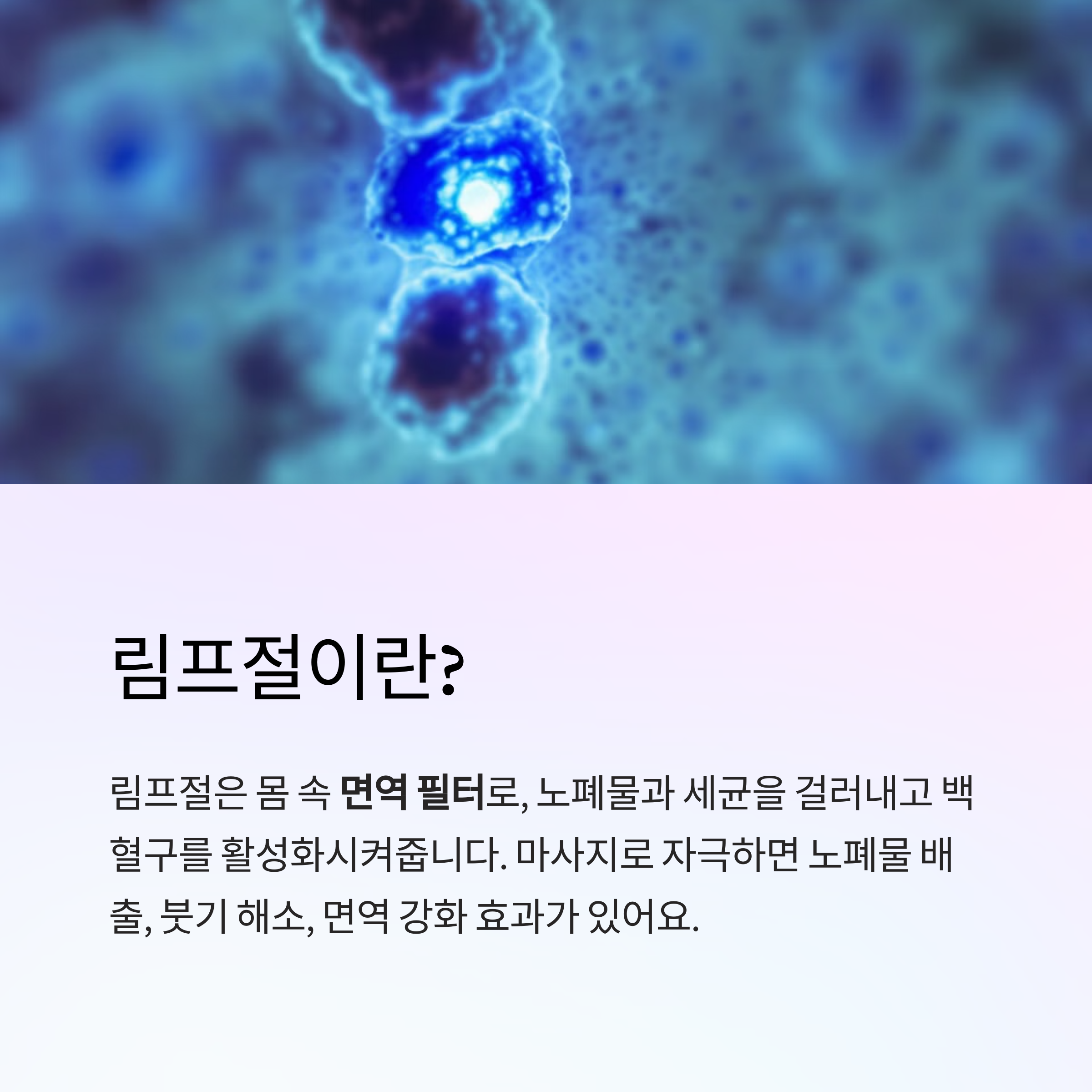림프절은 림프관 사이사이에 있는 **면역 필터**예요. 노폐물과 세균을 걸러내고, 백혈구를 활성화시켜주는 역할을 하죠. 마사지로 이 림프절을 자극하면 노폐물 배출 + 붓기 해소 + 면역 강화 효과가 생깁니다.