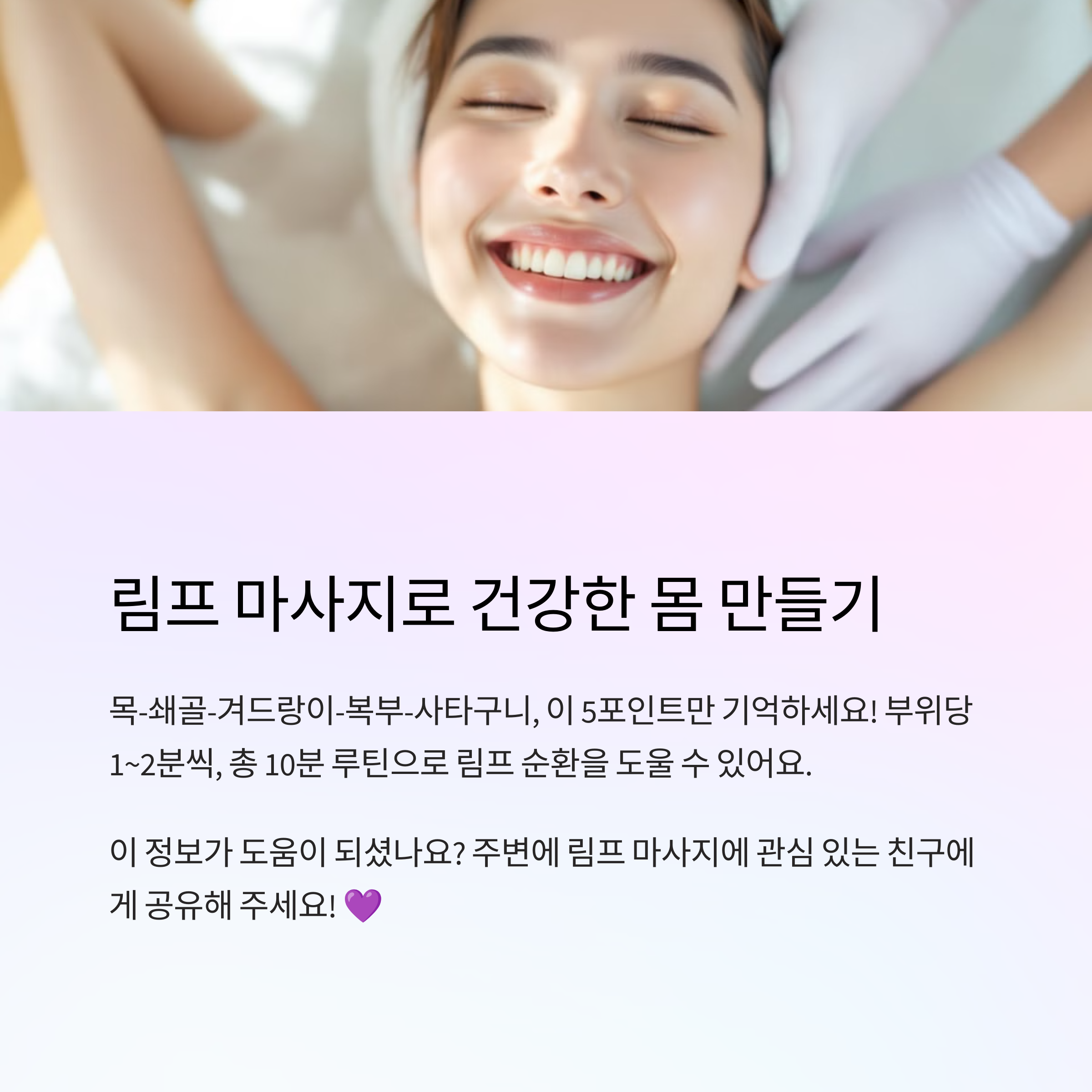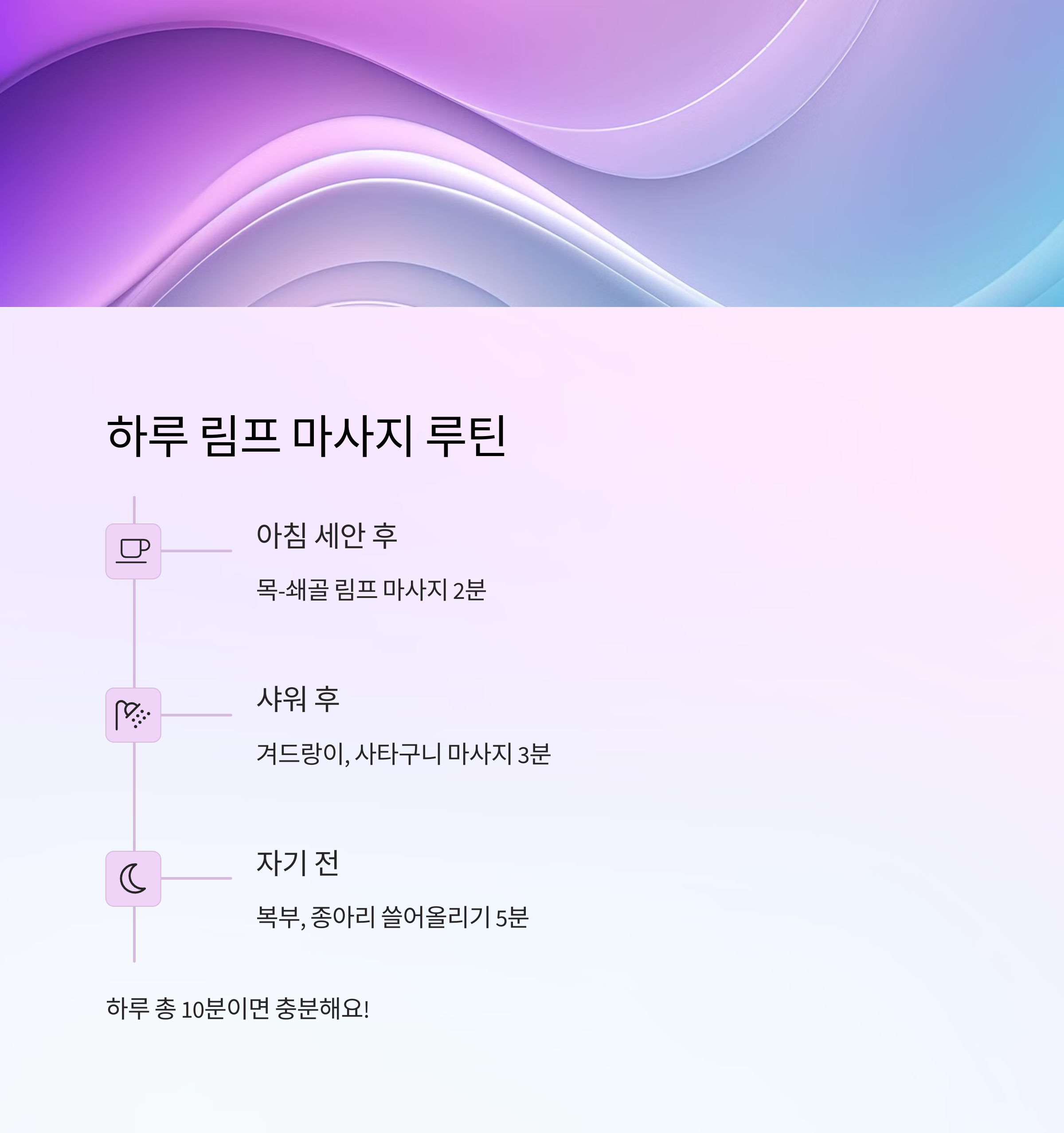 ✅ 순서: 목 → 쇄골 → 겨드랑이 → 복부 → 사타구니 ✅ 시간: 부위당 1~2분씩, 총 10분 루틴 ✅ 도구: 손, 림프롤러, 마사지오일 등 활용 가능