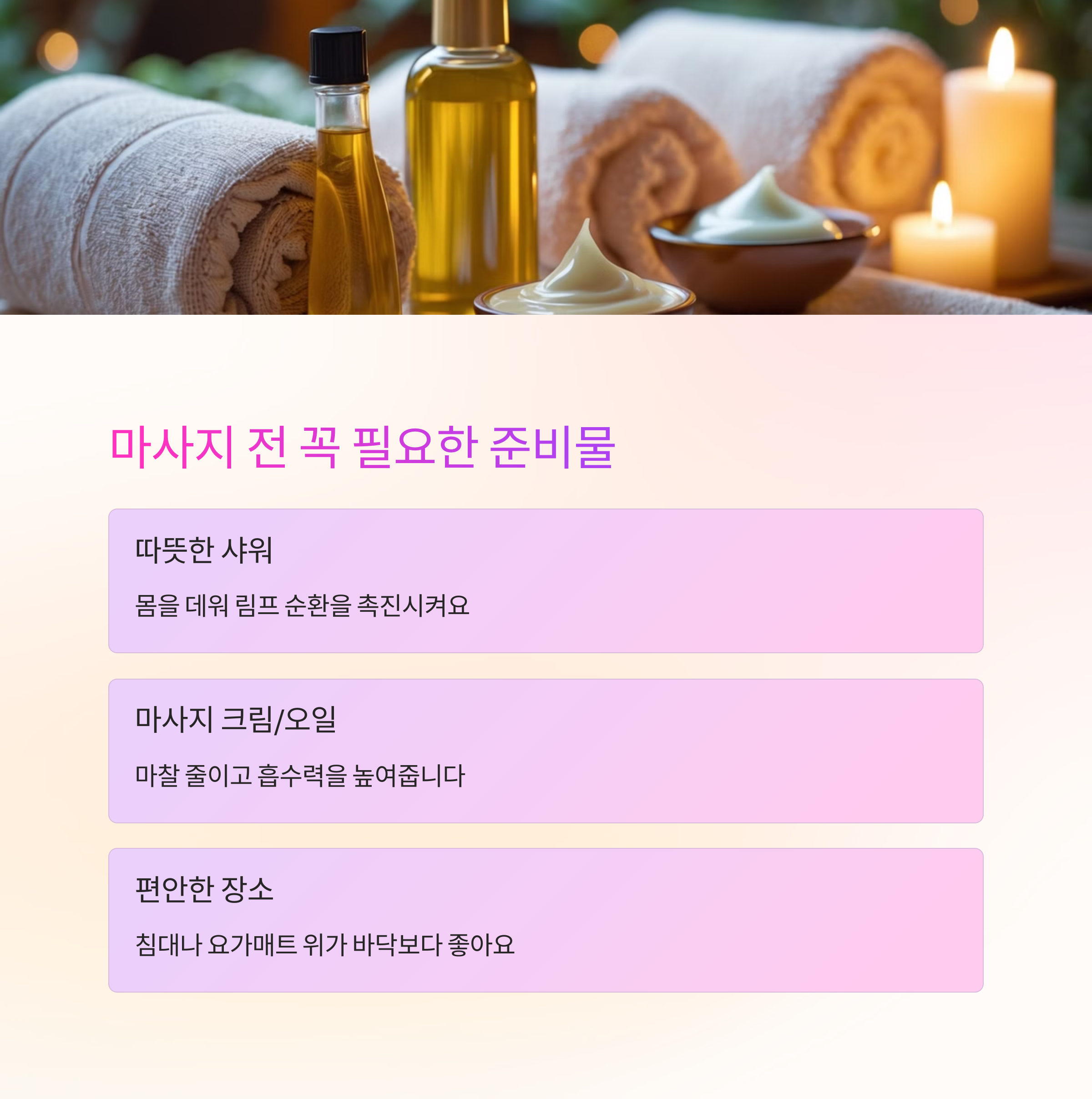마사지 전엔 따뜻한 샤워로 몸을 데워주세요. 크림이나 오일도 준비해 주세요! 마찰을 줄이고 흡수력도 좋아집니다. 장소는 바닥보다 침대나 요가매트 위가 좋아요. 손은 따뜻하게, 리듬은 천천히가 기본이에요😊