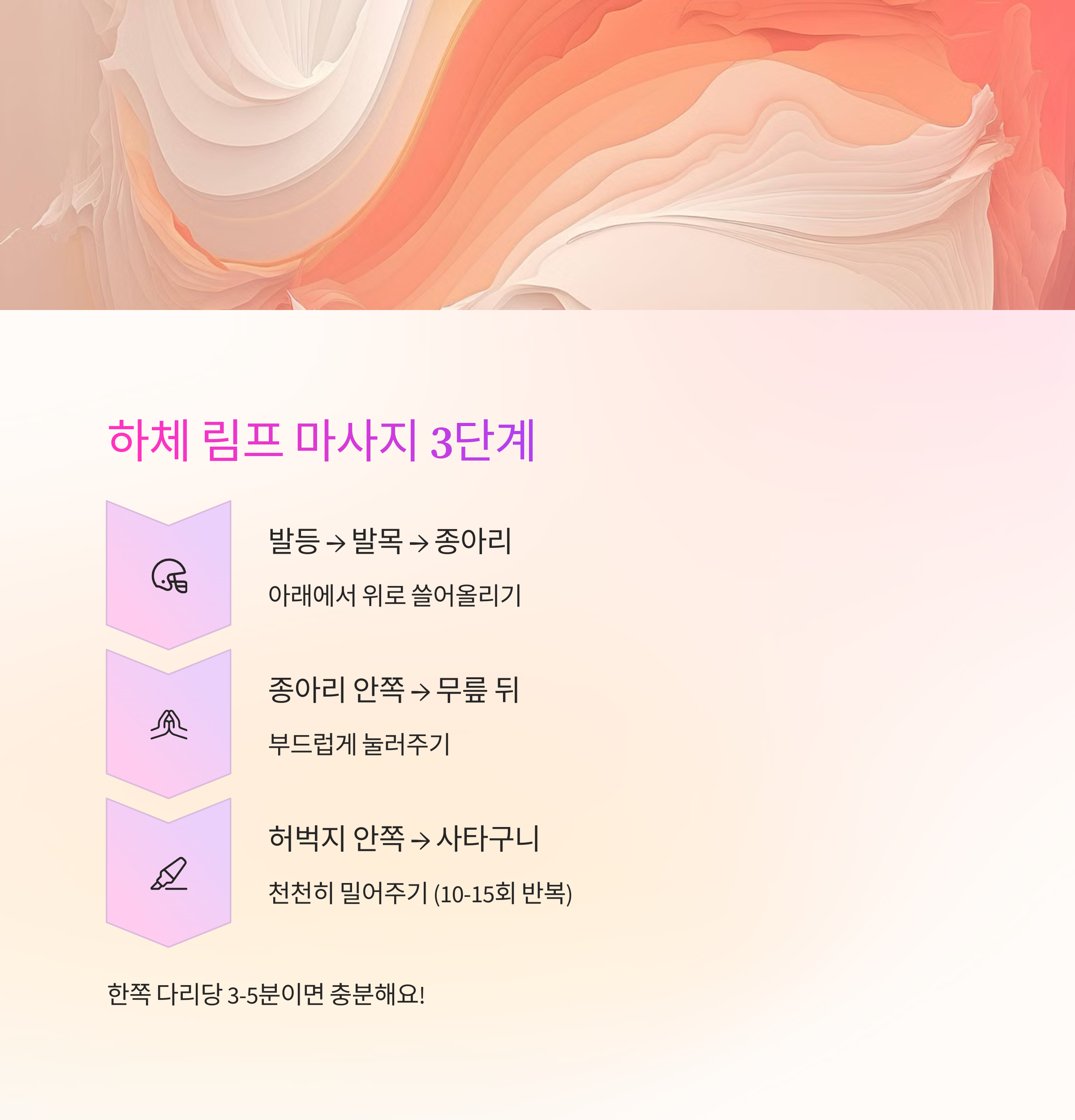 1) 발등 → 발목 → 종아리 방향으로 쓸어올리기 2) 종아리 안쪽 → 무릎 뒤쪽 눌러주기 3) 허벅지 안쪽 → 사타구니 쪽으로 천천히 밀어주기 각 부위는 10~15회 정도 반복, 한쪽당 3~5분이면 충분합니다!