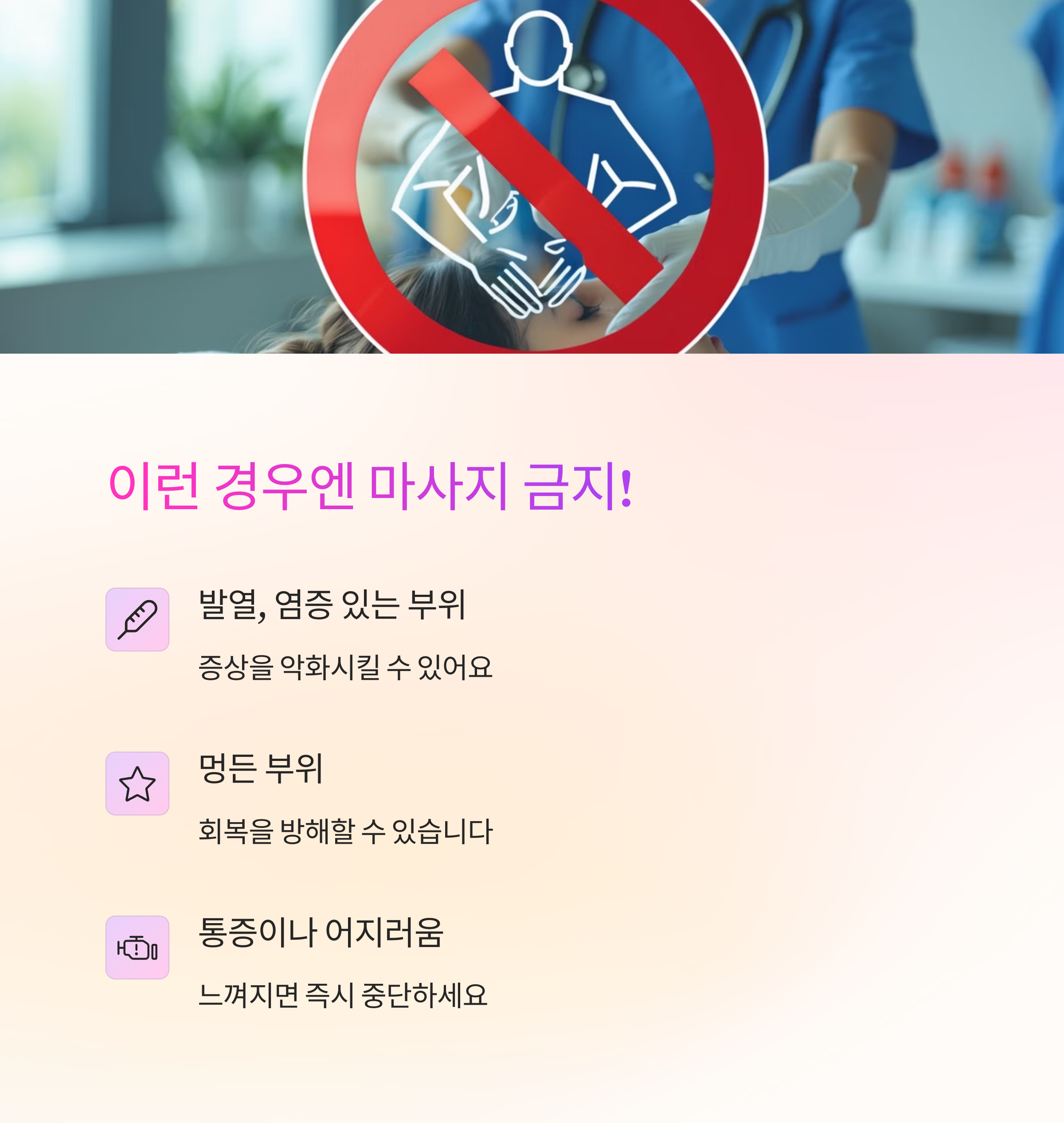 발열, 염증, 멍든 부위엔 마사지 금지! 림프절 부위를 너무 세게 누르거나, 차가운 손으로 바로 마사지하는 것도 피해주세요. 마사지 중 아프거나 어지러우면 즉시 중단! 몸 상태에 따라 강도 조절이 필요해요.