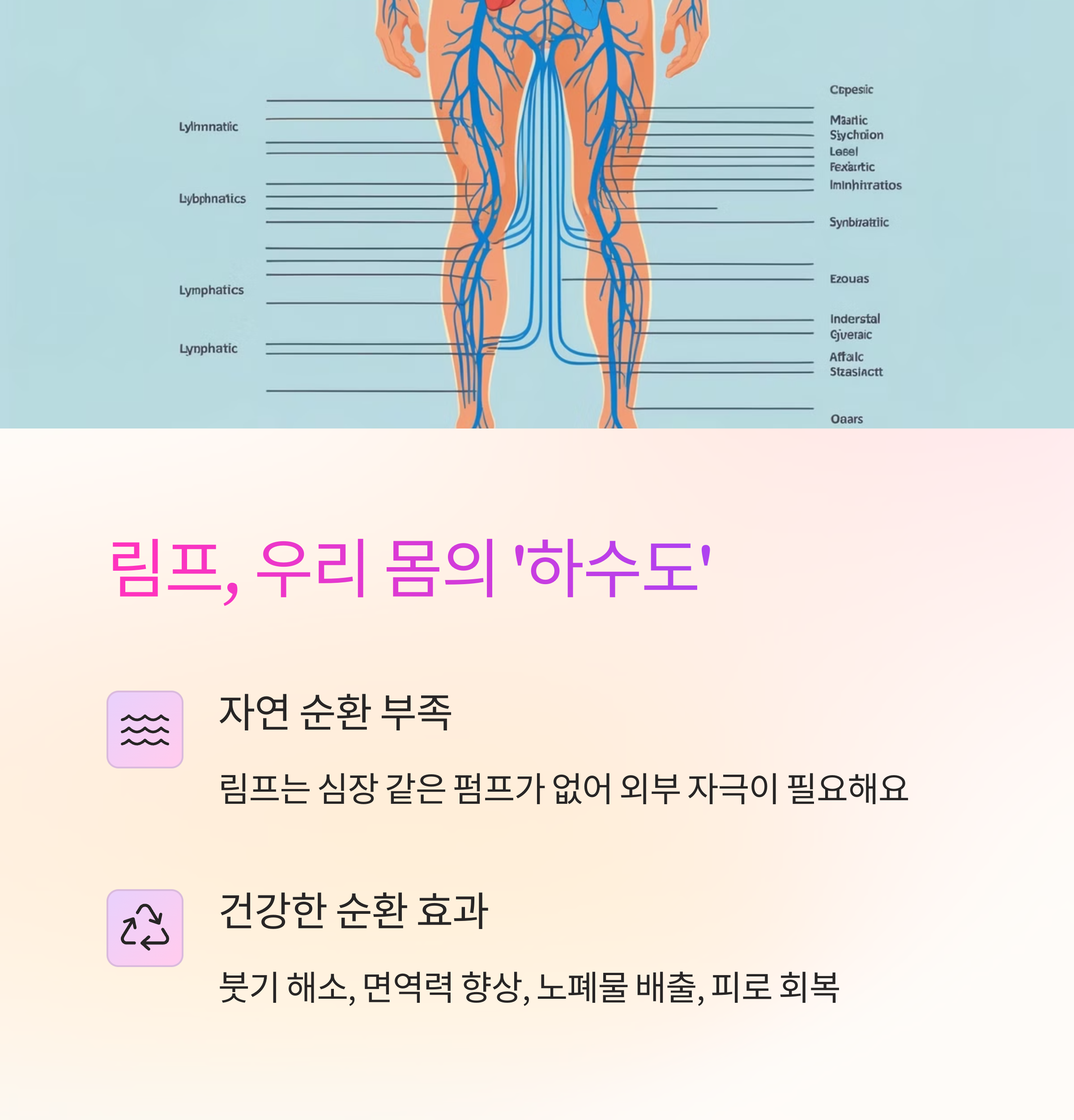 림프는 혈액처럼 온몸을 순환하지만, 심장처럼 펌프가 없어요. 그래서 움직이거나 마사지를 통해 **외부에서 자극**을 줘야 흐릅니다. 림프가 잘 순환되면, 붓기 해소는 물론이고 면역력 향상, 노폐물 배출, 피로 회복까지 도움이 돼요. 하체 붓기 잡고 싶다면 림프 순환부터 챙기세요!