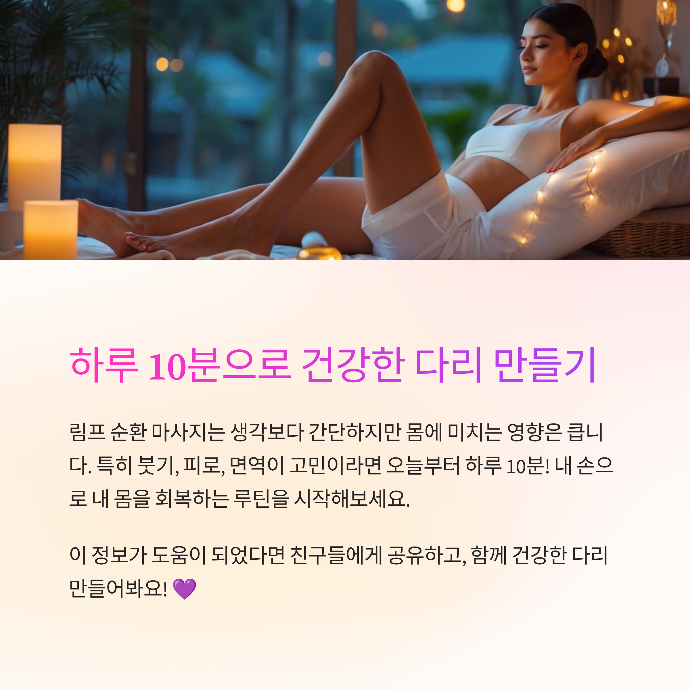 마사지 전 따뜻한 물 한 컵 → 마사지 후 냉찜질 5분 → 취침 시 다리 쿠션 받치기 → 이렇게 하면 림프 순환 + 붓기 개선 효과가 훨씬 커져요! 꾸준히 하면 다리 라인도 점점 정리됩니다✨