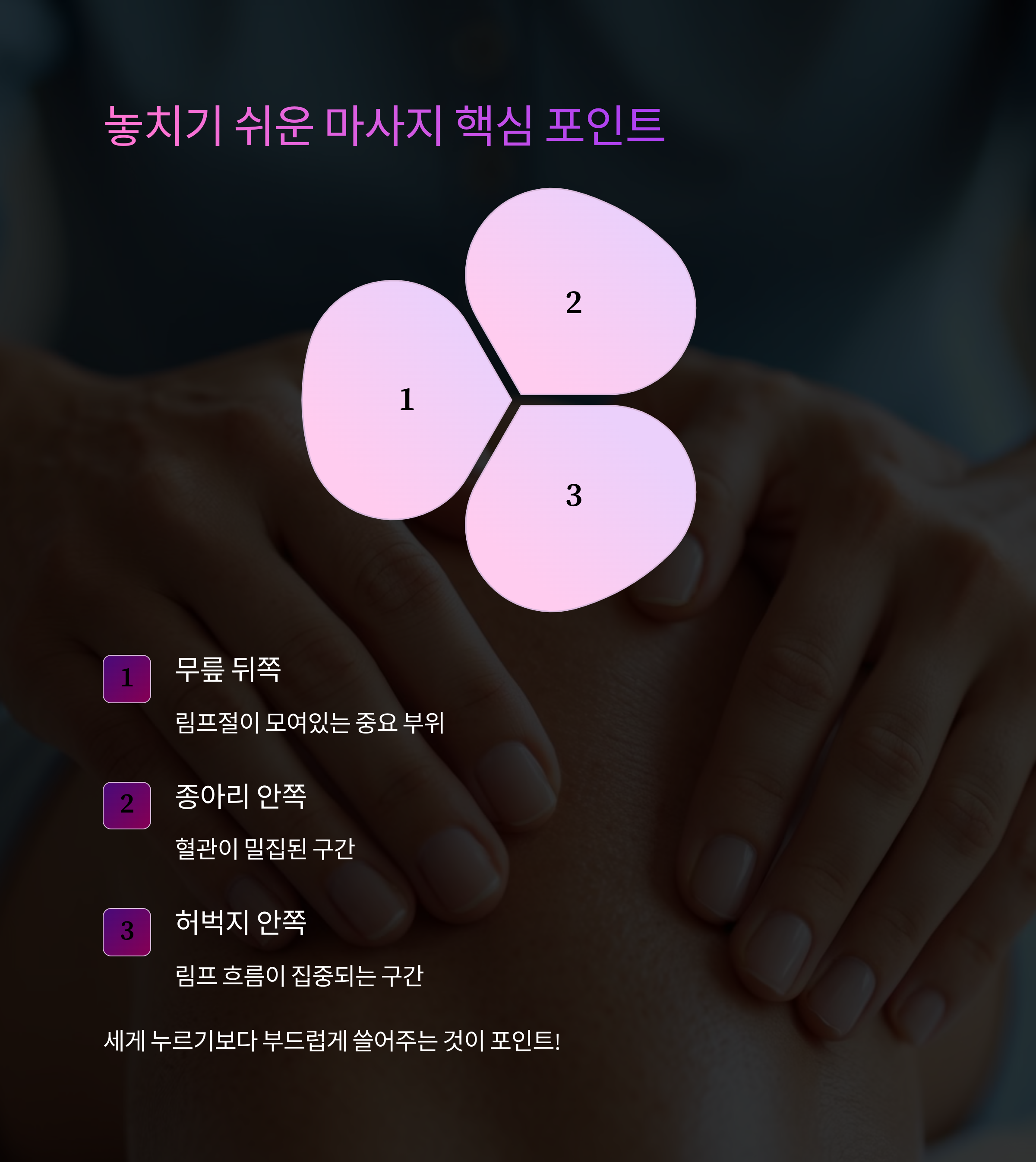 ✔ 무릎 뒤쪽 (림프절 모여 있음) ✔ 종아리 안쪽 (혈관 밀집) ✔ 허벅지 안쪽 (림프 흐름 집중 구간) 이 세 곳은 꼭 챙겨주세요. 힘은 세게 줄 필요 없고, 깊게 누르기보다 부드럽게 쓸어주는 게 포인트!
