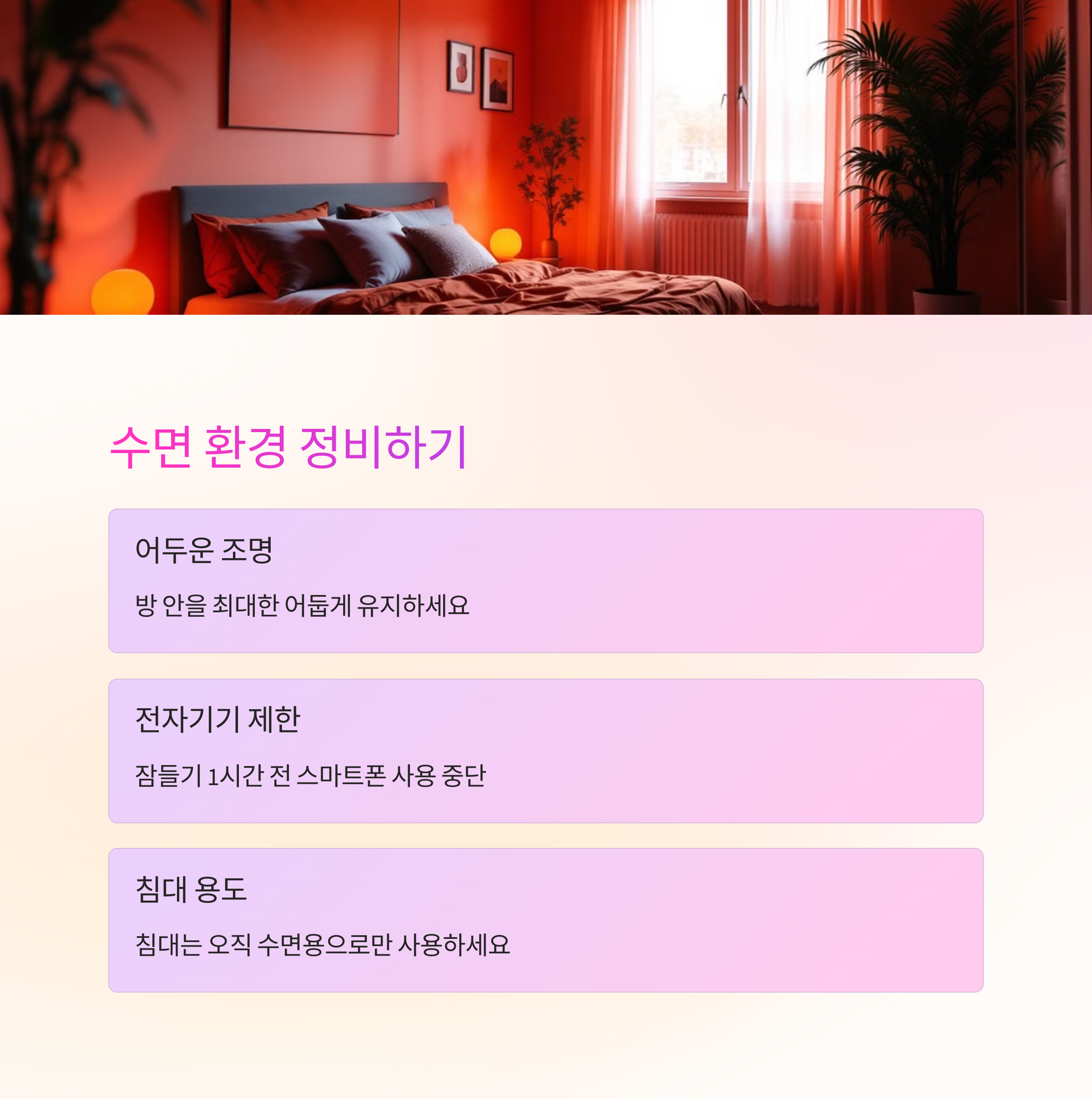 수면 환경은 수면의 질에 직접적인 영향을 줍니다. 방 안의 조명은 최대한 어둡게 하고, 침대는 오직 수면용으로 사용하는 것이 좋습니다. 전자기기의 빛은 수면을 방해하므로 잠들기 1시간 전에는 스마트폰이나 TV 사용을 줄이세요.