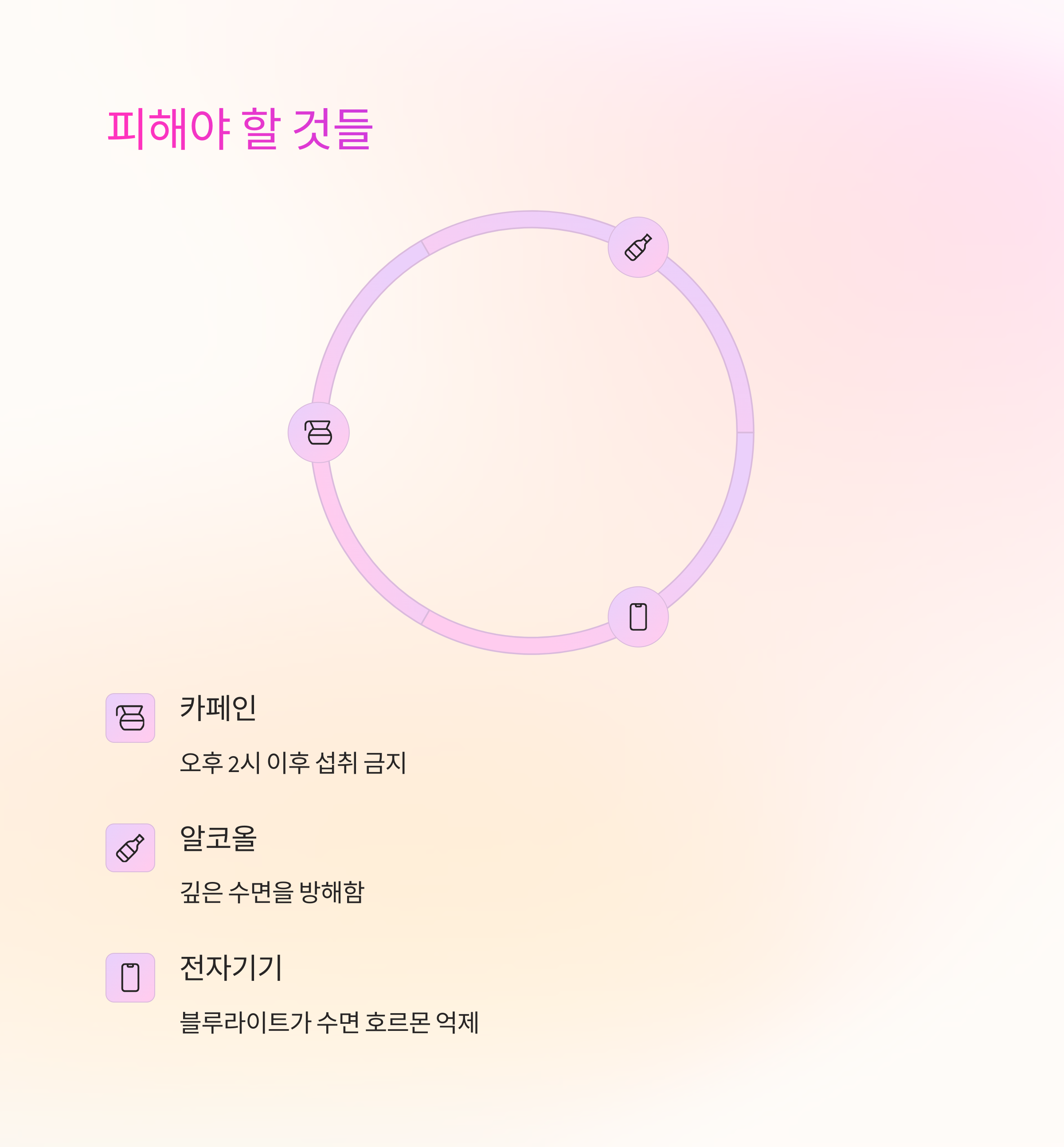 카페인은 뇌를 자극하는 성분으로, 오후 2시 이후에는 커피, 초콜릿, 에너지 음료 등을 삼가는 것이 좋습니다. 알코올은 잠을 유도하는 듯하지만 실제로는 깊은 수면을 방해하므로 섭취를 피해야 합니다.