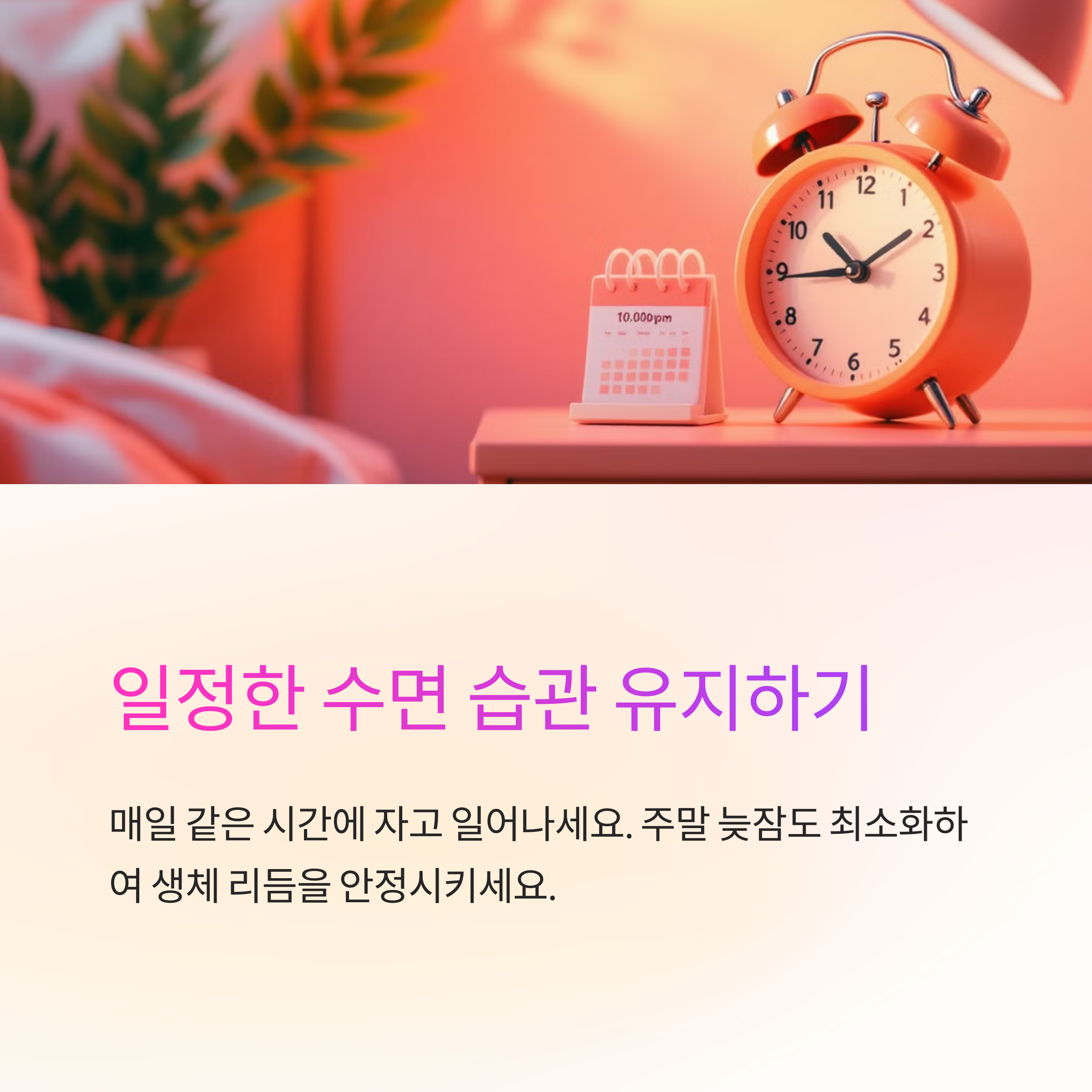매일 같은 시간에 자고 일어나는 것은 수면 리듬을 안정시키는 데 매우 효과적입니다. 주말이라도 늦잠은 최소화하고, 수면 시간을 일정하게 유지해보세요. 생체 리듬이 안정되면 자연스럽게 잠들고 깨는 시간이 규칙적으로 변합니다.
