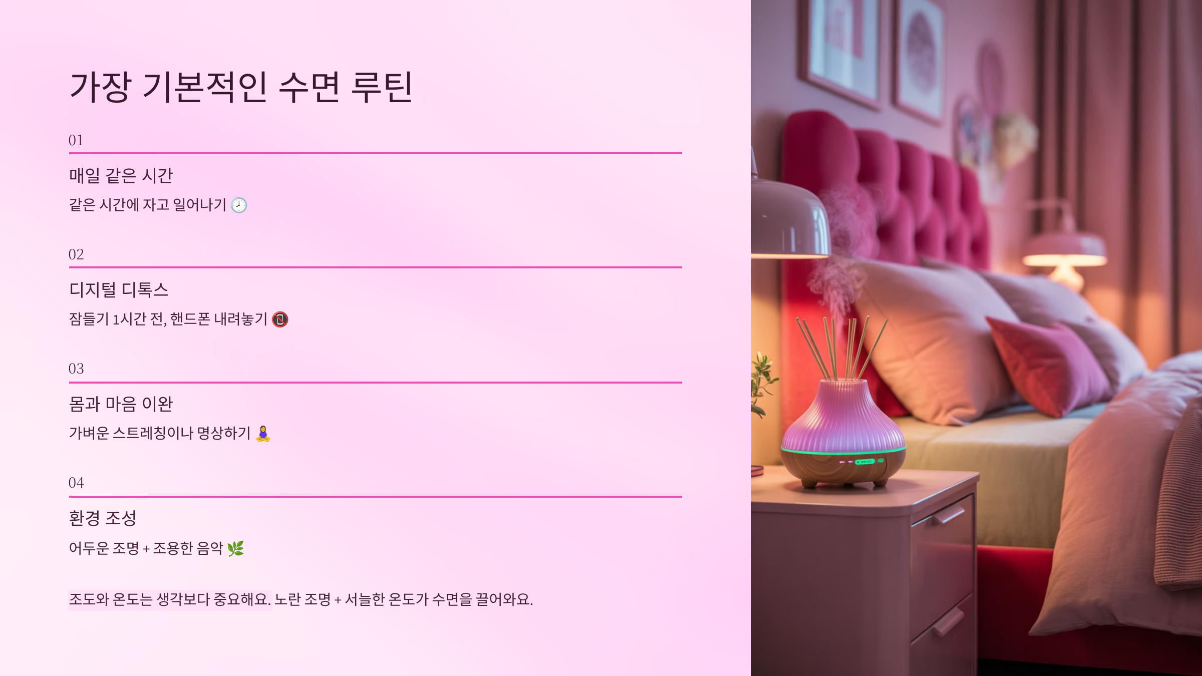 수면 루틴, 거창할 필요 없어요. 진짜 중요한 건 '반복'과 '의식 전환'이에요. "나는 이젠 푹 잘 수 있다"는 믿음이 잠을 더 부드럽게 끌어오더라구요.