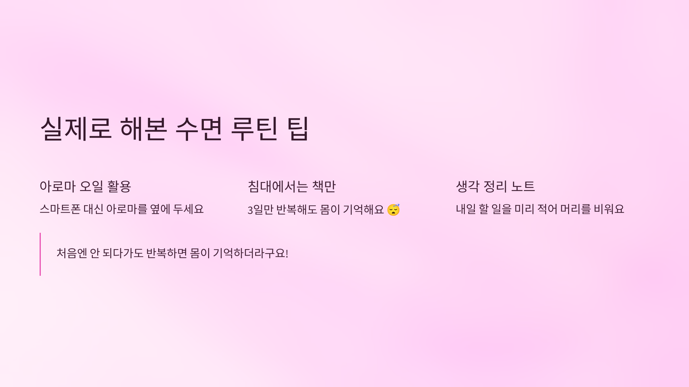 루틴은 완벽해야 하는 게 아니라, 꾸준히 반복하는 게 핵심이에요! 하루만 지켜도 몸은 신호를 기억하기 시작해요 😌