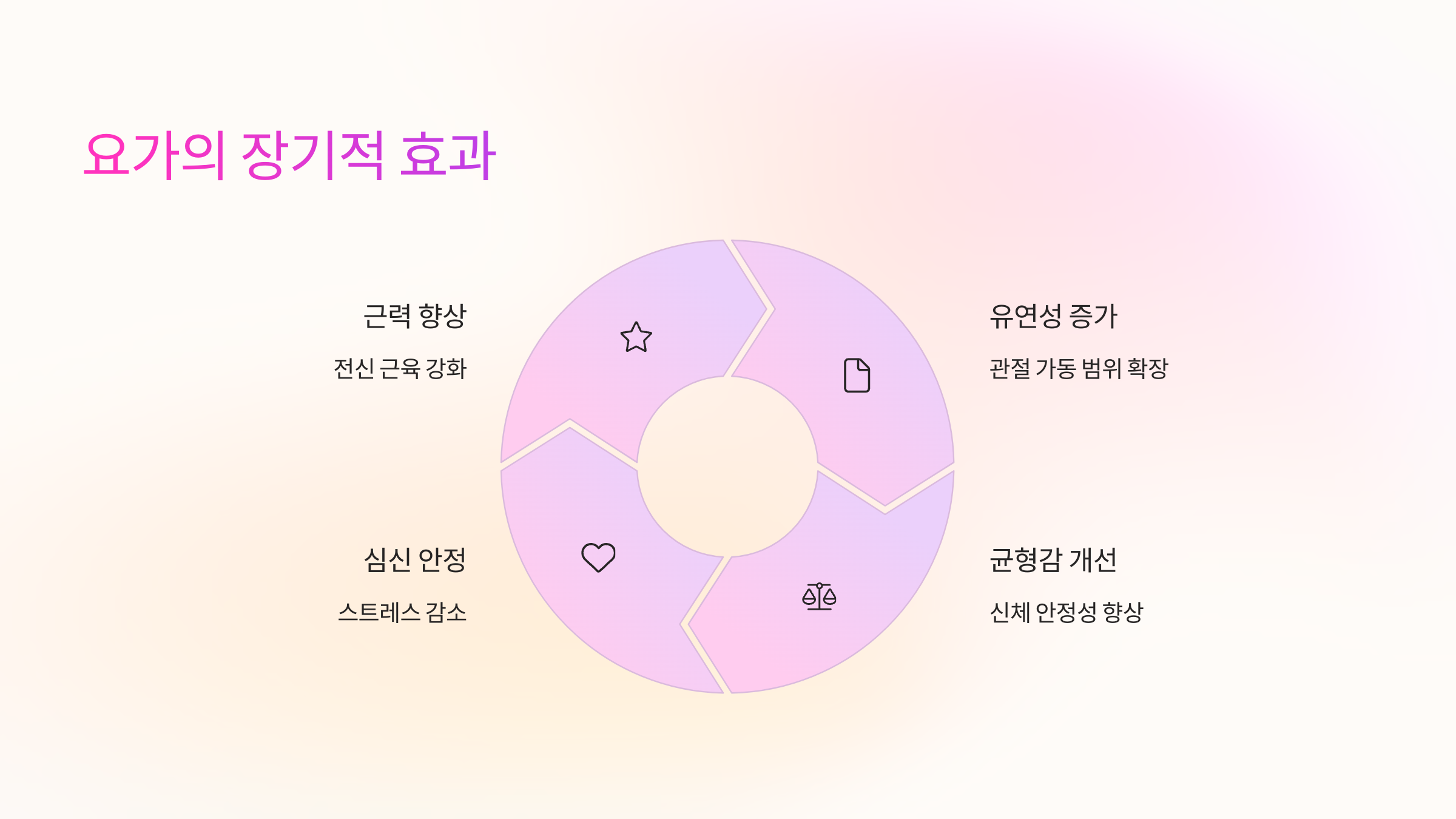 요가는 단순히 몸을 움직이는 것을 넘어서, 정신을 안정시키고 불안을 줄이는 효과가 있습니다.