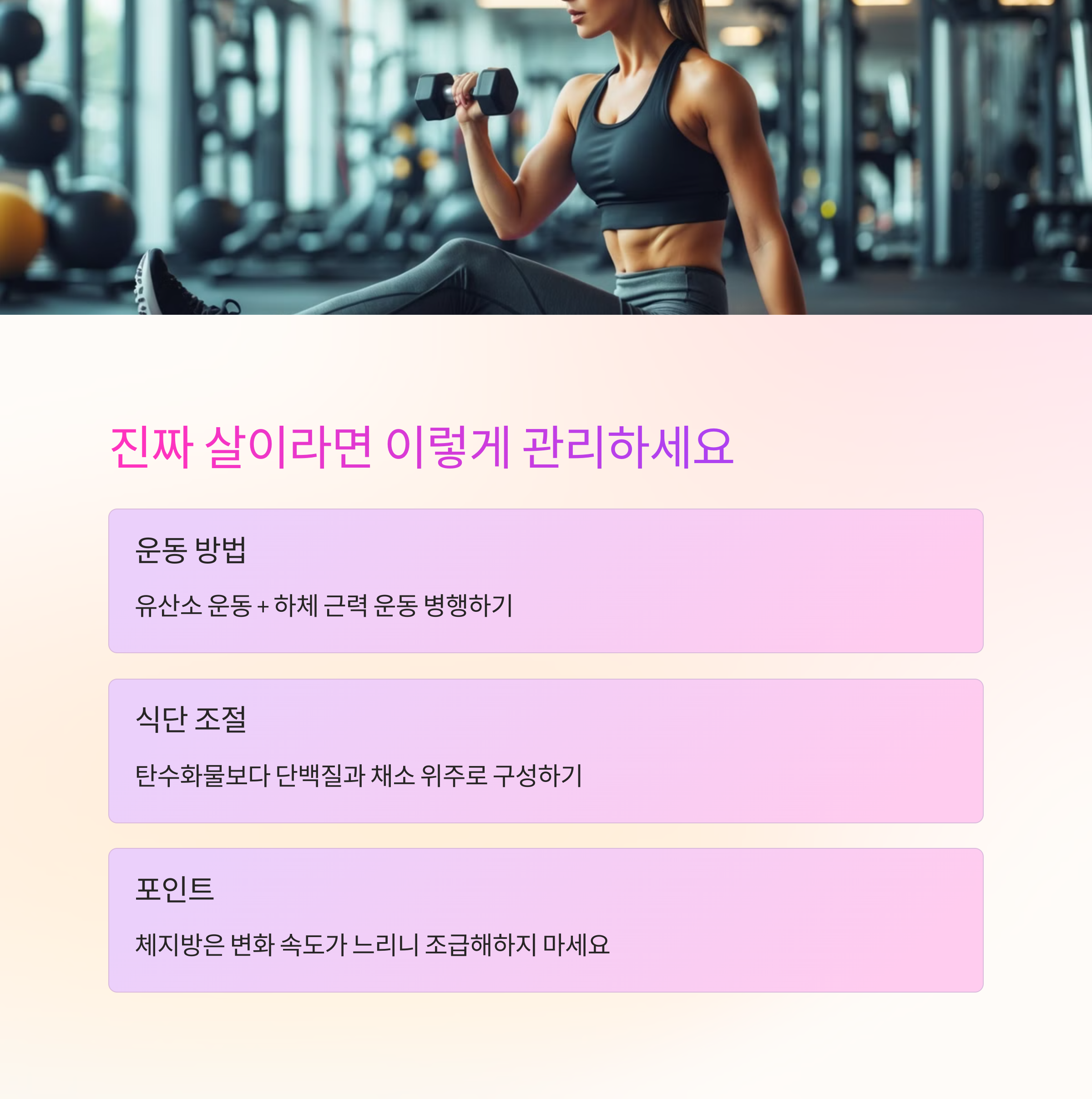 살이라면 운동과 식단 조절이 핵심입니다. 특히 유산소 운동 + 하체 근력 운동을 병행하고, 탄수화물보다 단백질과 채소 위주의 식단을 구성하면 좋아요. 하지만 체지방은 변화 속도가 느리니, 조급해하지 않는 게 포인트😉