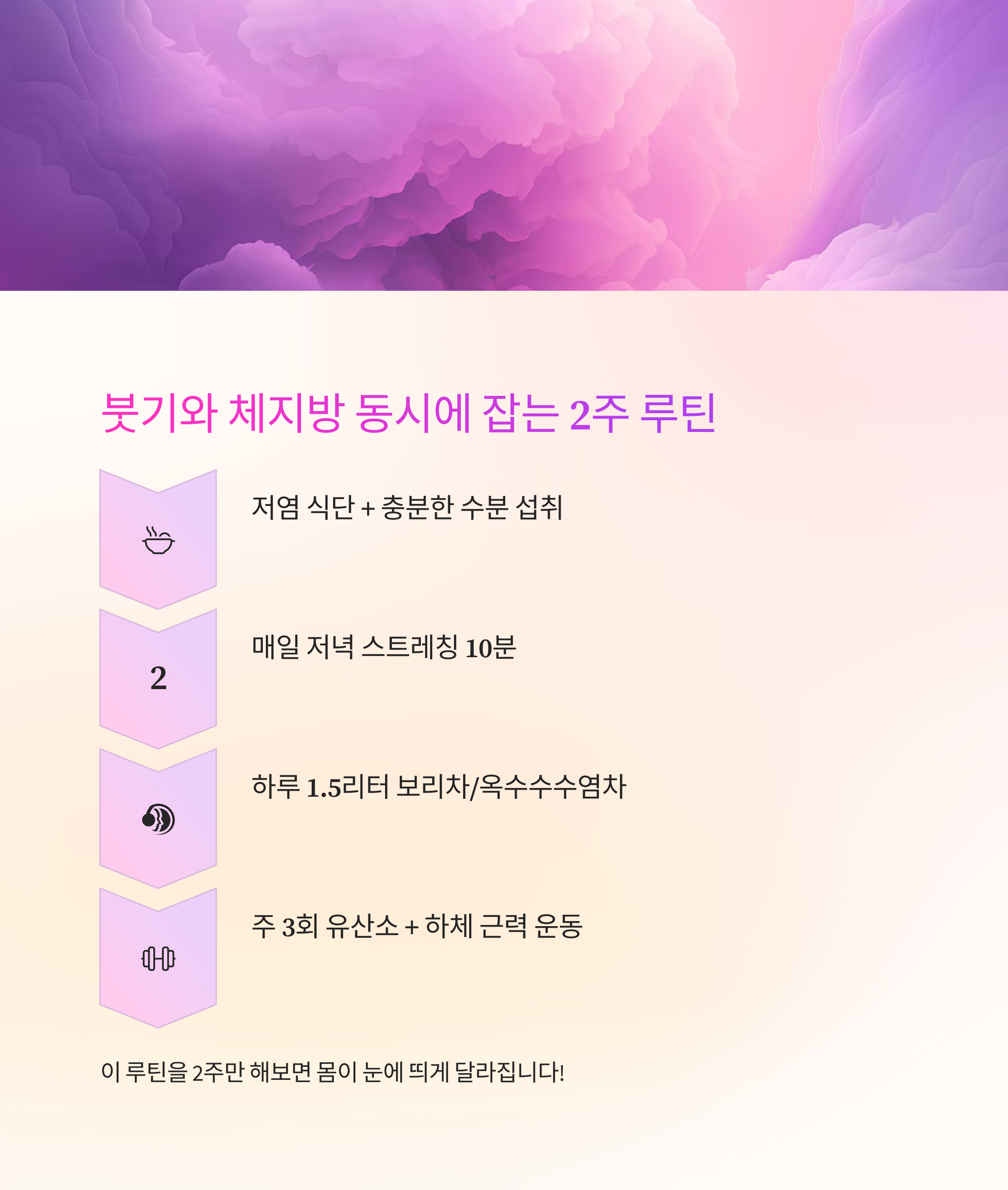 1) 저염 식단 + 수분 섭취 2) 매일 저녁 스트레칭 10분 3) 하루 1.5리터 보리차 또는 옥수수수염차 4) 주 3회 유산소 + 하체 근력 이 루틴을 2주만 해보면 몸이 눈에 띄게 달라집니다!