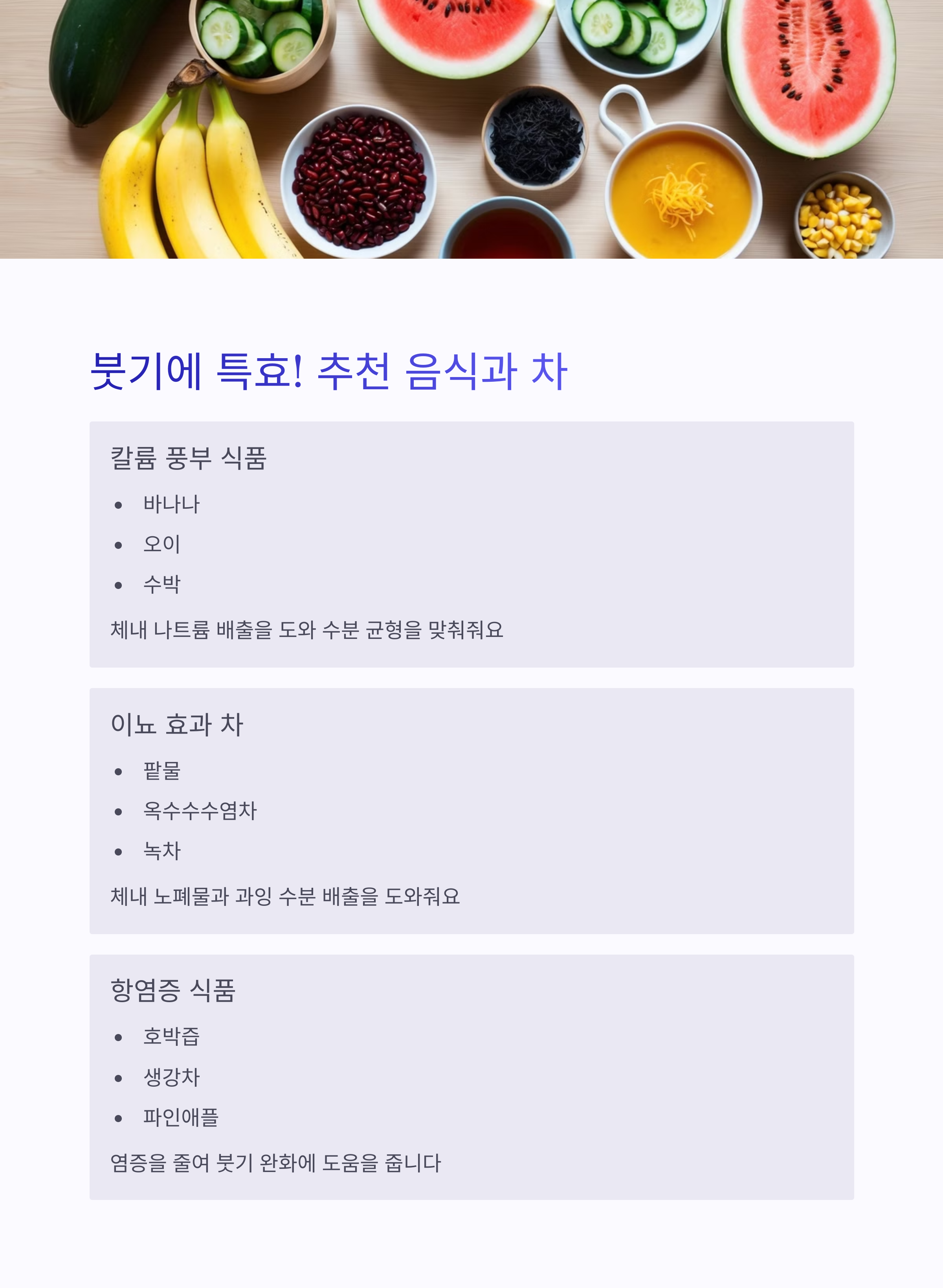 팥물, 호박즙, 옥수수수염차는 붓기에 좋다고 유명하죠! 또 바나나, 오이, 수박 같은 칼륨 풍부한 음식도 체내 수분 조절에 도움을 줘요. 몸이 가벼워지는 느낌, 직접 느껴보세요🌿