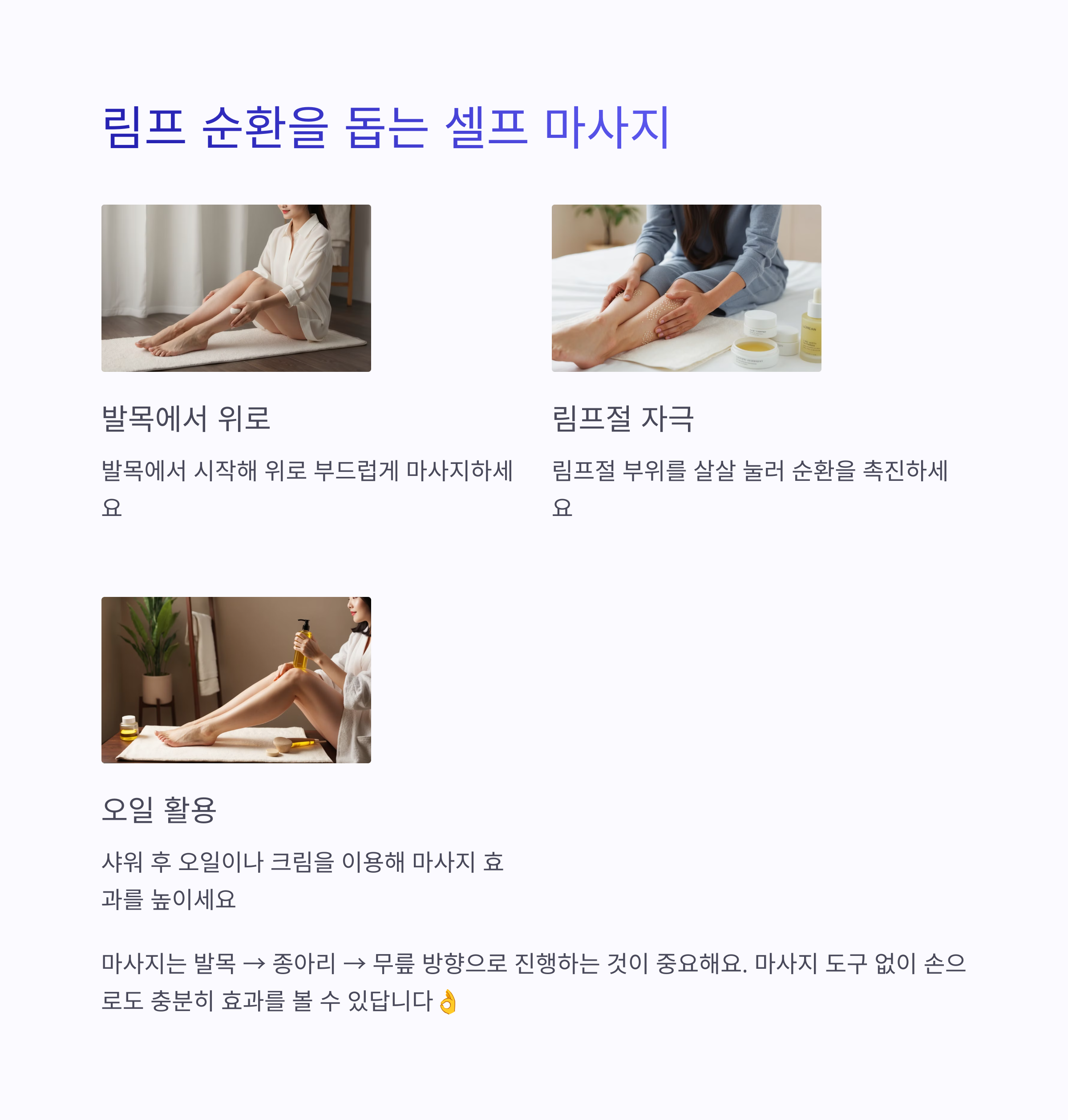 샤워 후 오일이나 크림을 이용해 발목 → 종아리 → 무릎 방향으로 마사지해보세요. 림프절 있는 부위를 살살 눌러주는 것도 핵꿀팁! 마사지 도구 없이 손으로도 충분히 가능해요👌