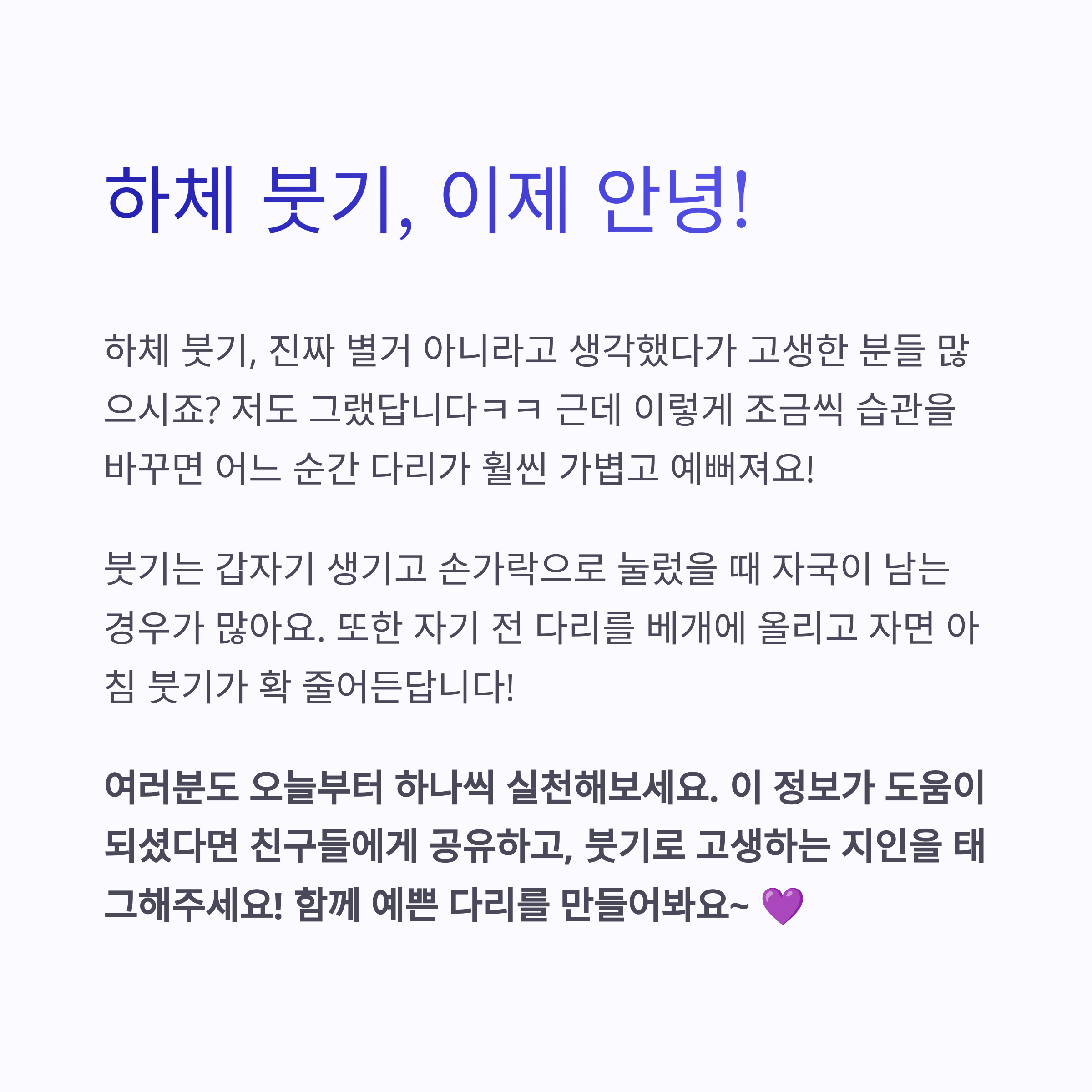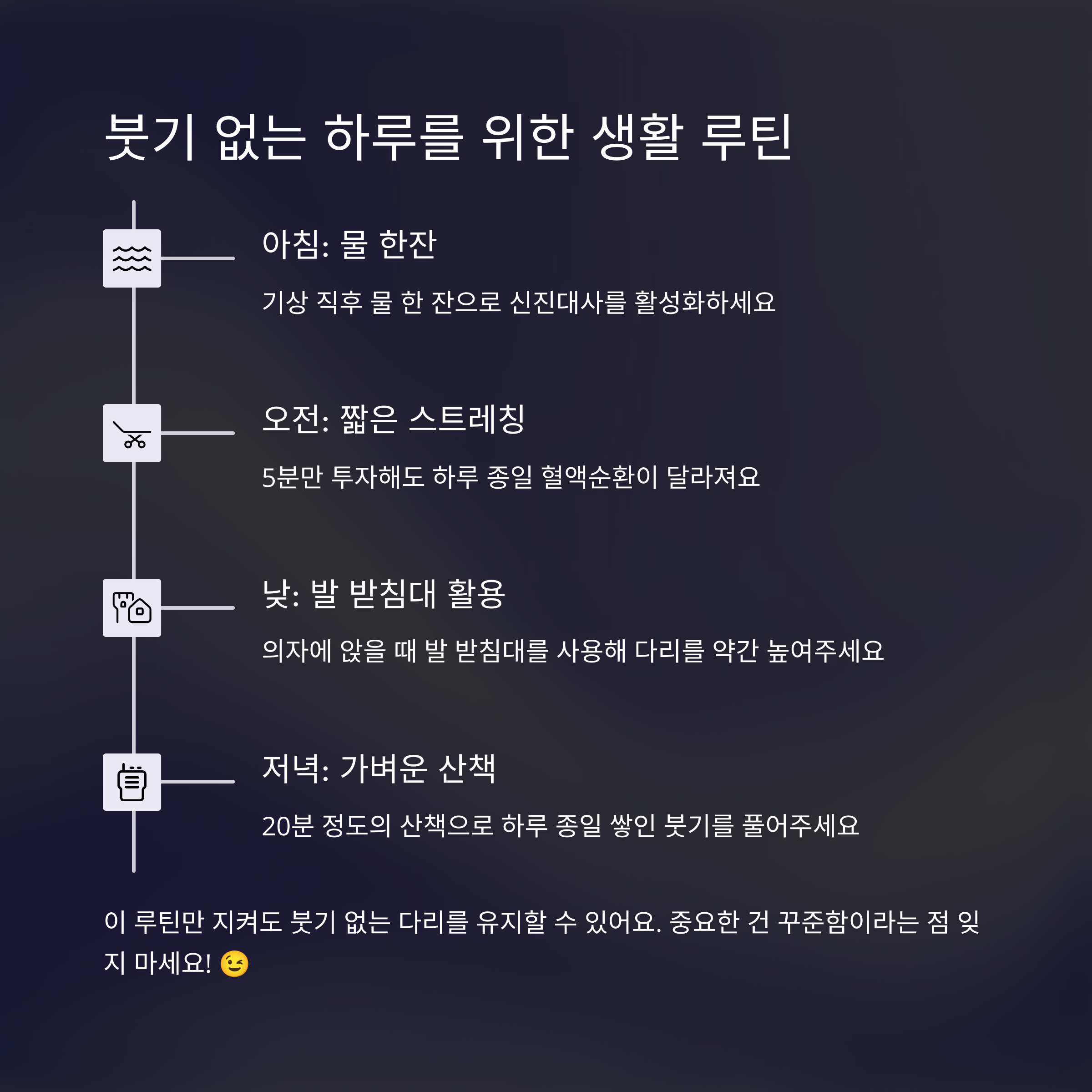 기상 후 물 한잔 → 짧은 스트레칭 → 의자 대신 발 받침 → 저녁엔 가벼운 산책! 이 루틴만 지켜도 붓기 없는 다리를 유지할 수 있어요💜 중요한 건 꾸준함이라는 점! 😉