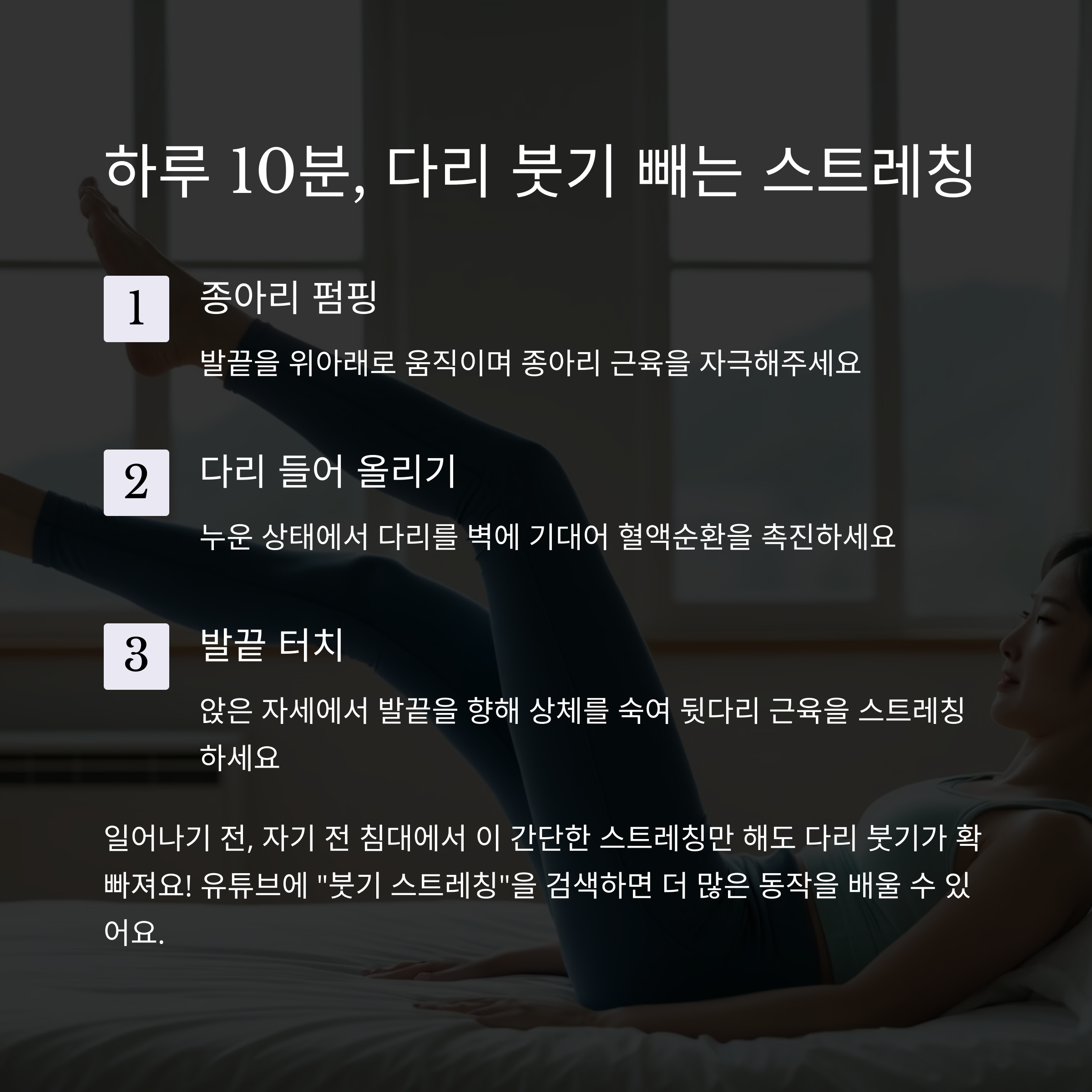 일어나기 전, 자기 전 침대에서 간단한 스트레칭만 해도 다리 붓기가 확 빠져요! 종아리 펌핑, 다리 들어 올리기, 발끝 터치 등은 기본✨ 유튜브에 "붓기 스트레칭" 검색하면 금방 따라 할 수 있어요.