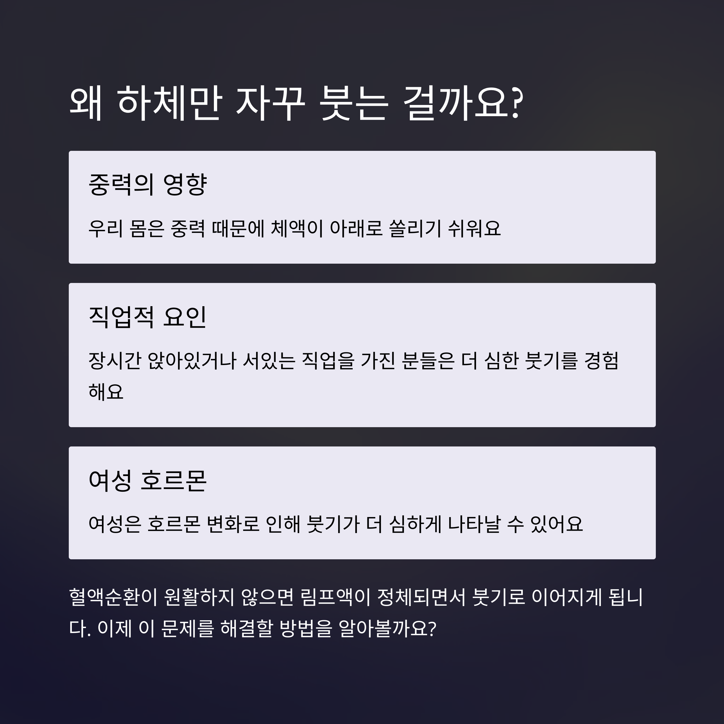 우리 몸은 중력 때문에 체액이 아래로 쏠리기 쉬워요. 특히 장시간 앉아 있거나 서 있는 직업을 가진 분들은 더 심하죠. 혈액순환이 원활하지 않으면 림프액이 정체되면서 붓기로 이어져요. 특히 여성은 호르몬 변화 때문에 더 잘 붓는 경향이 있다는 점!😢
