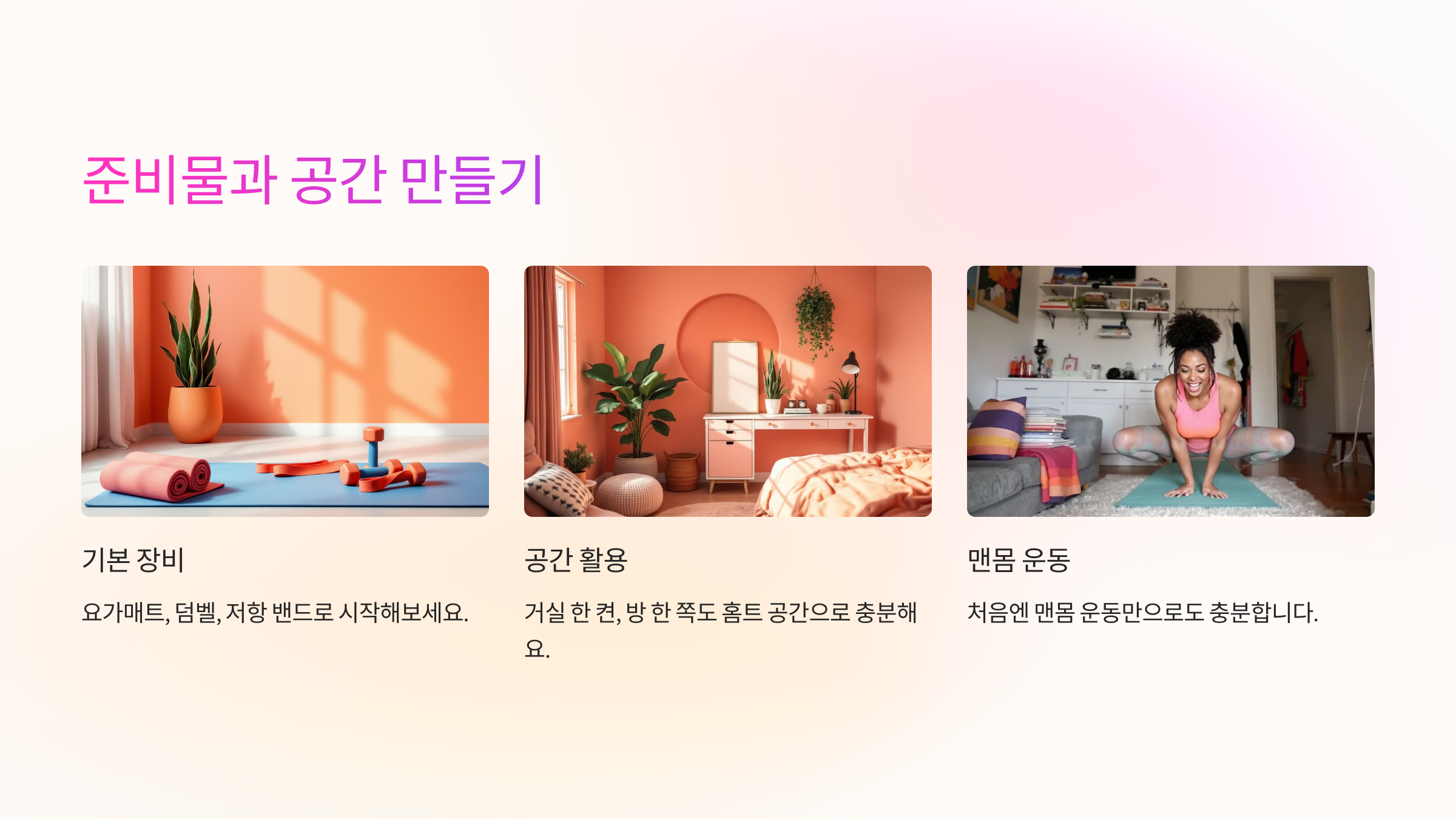 처음엔 맨몸 운동만으로도 충분하지만, 요가매트, 덤벨, 저항 밴드 등이 있으면 운동의 폭이 넓어집니다. 거실 한 켠, 방 한 쪽도 홈트 공간으로 손색없어요.