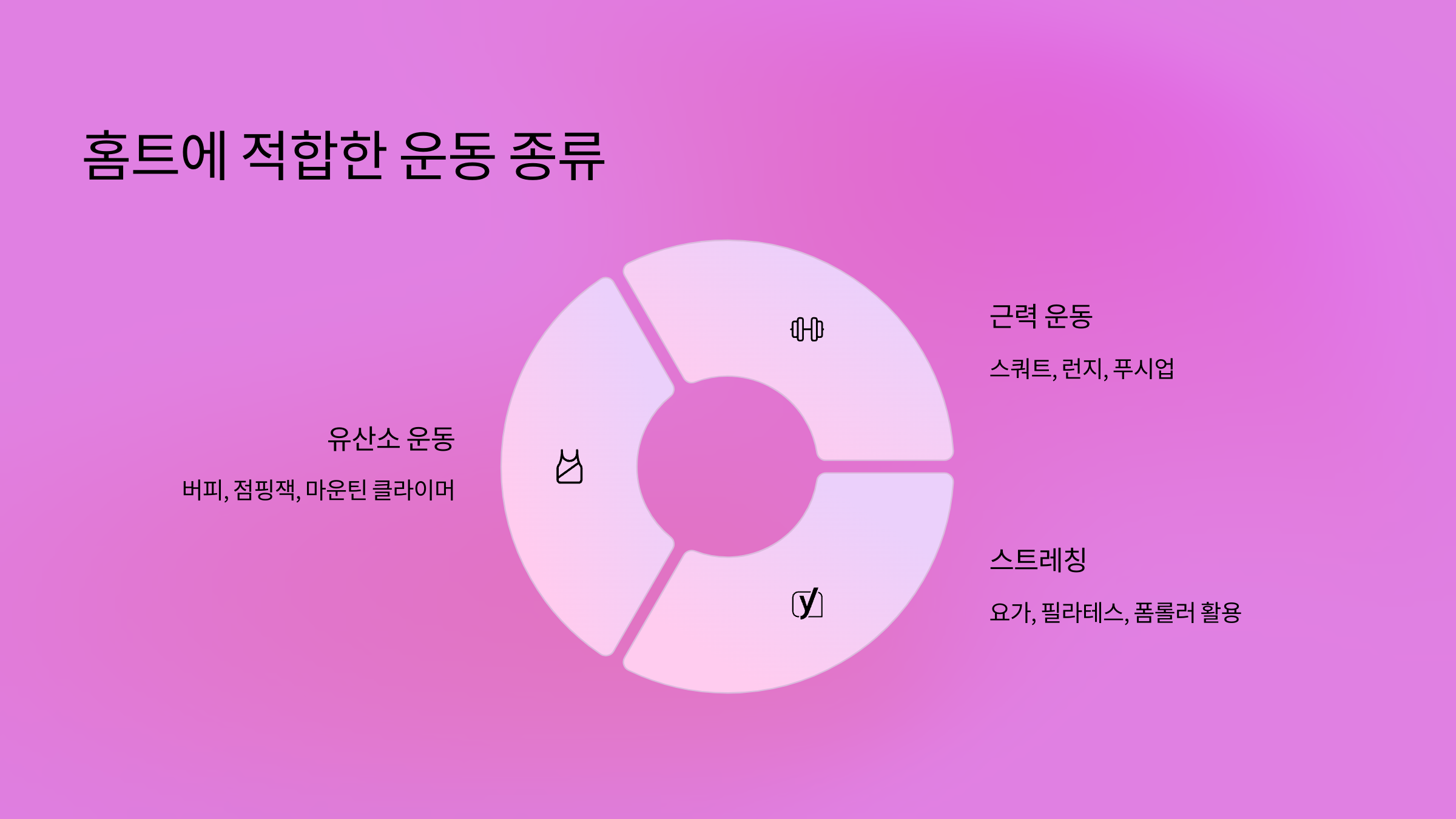 홈트는 크게 유산소 운동, 근력 운동, 스트레칭으로 나눌 수 있어요: