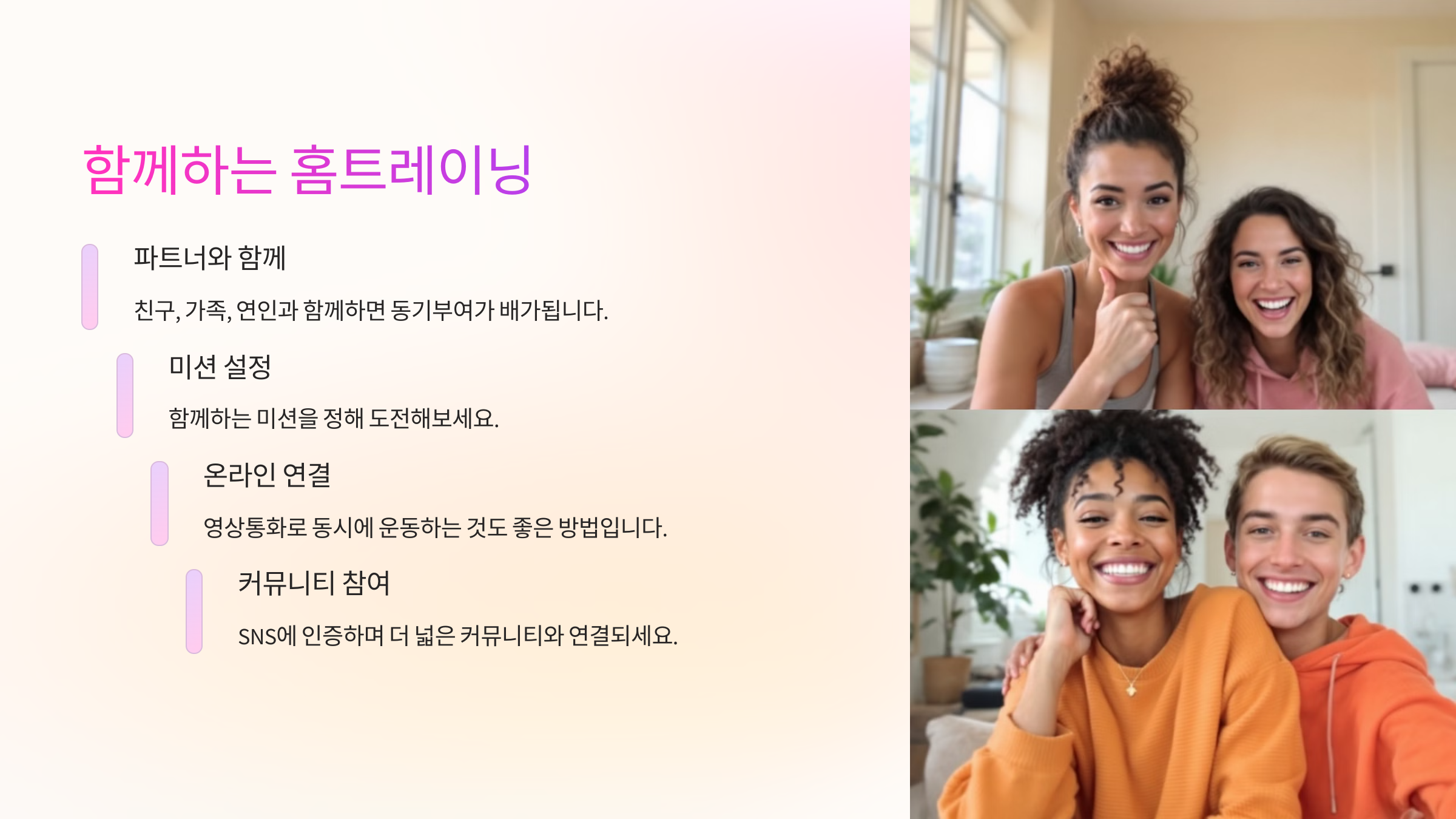 친구, 가족, 연인과 함께 홈트를 하면 꾸준함과 동기부여가 배가됩니다. 함께하는 미션을 정하거나, 영상통화로 동시에 운동하는 것도 좋아요. SNS에 인증하며 커뮤니티와 연결되는 것도 큰 도움이 됩니다.
