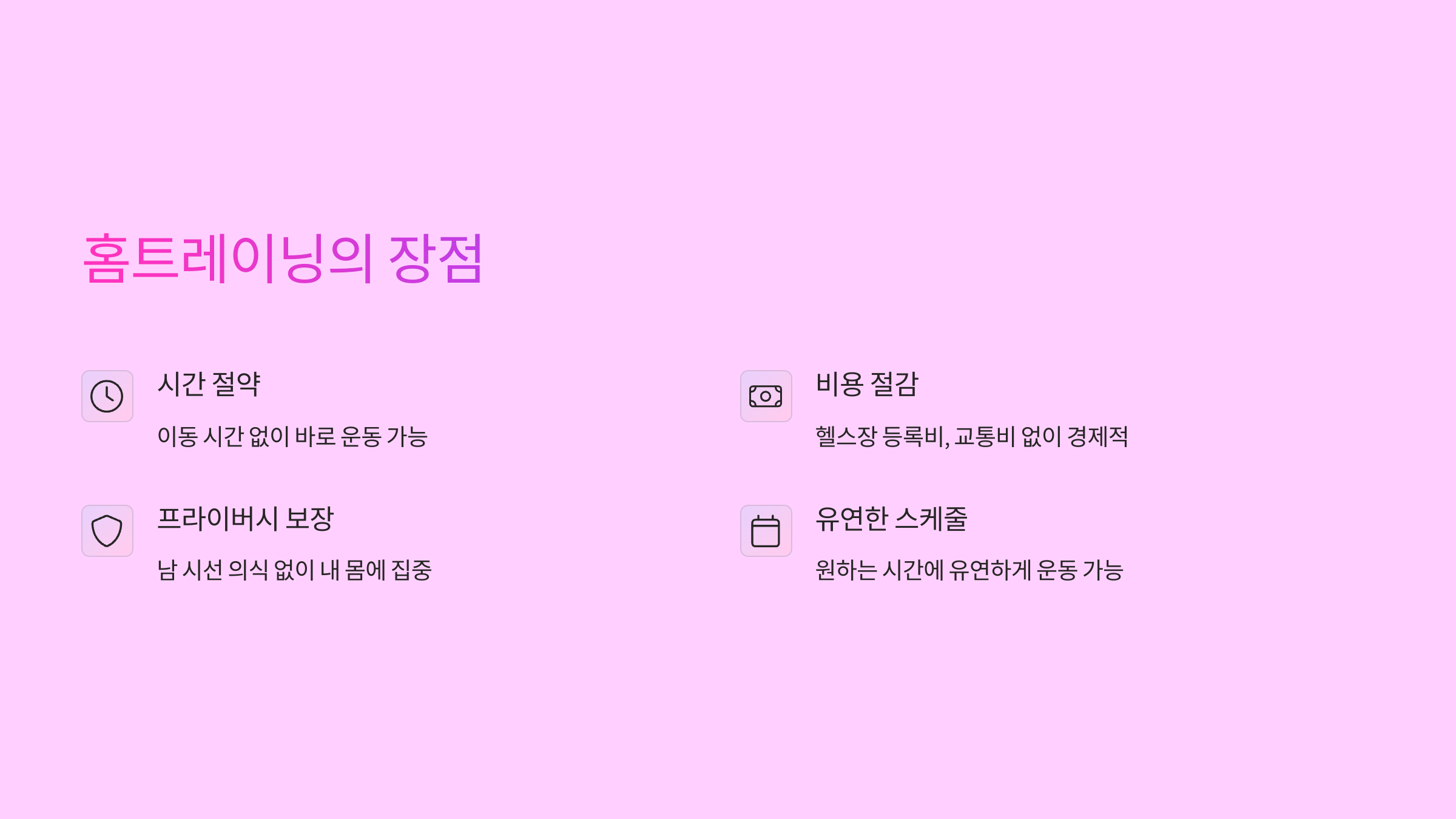 - 유연한 스케줄: 원하는 시간에 유연하게 운동 가능